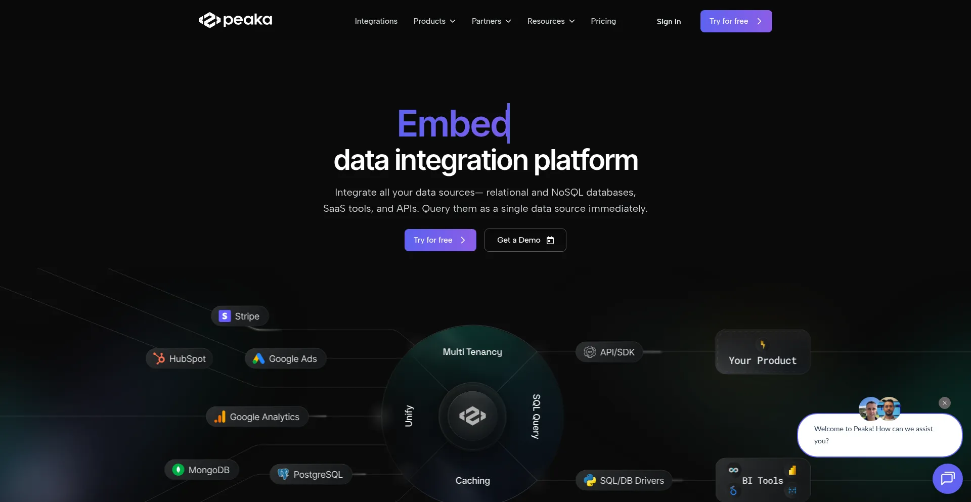 Peaka integrates all the data sources, such as databases, SaaS tools, NoSQL and APIs, and shows them as a single data source immediately.