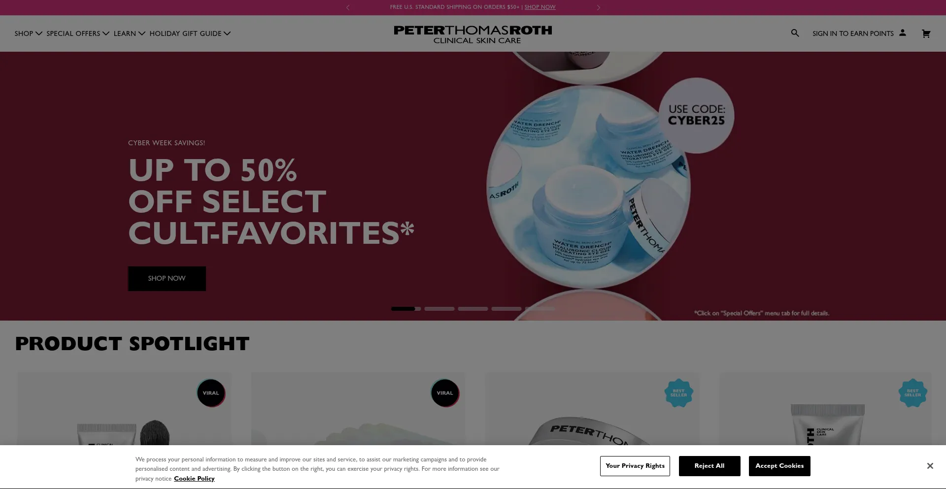 Analysis indicates that peterthomasroth.com operates as an e-commerce platform facilitating online transactions for goods or services. The website implements shopping cart functionality, payment processing systems, and product catalog features typical of commercial retail operations.