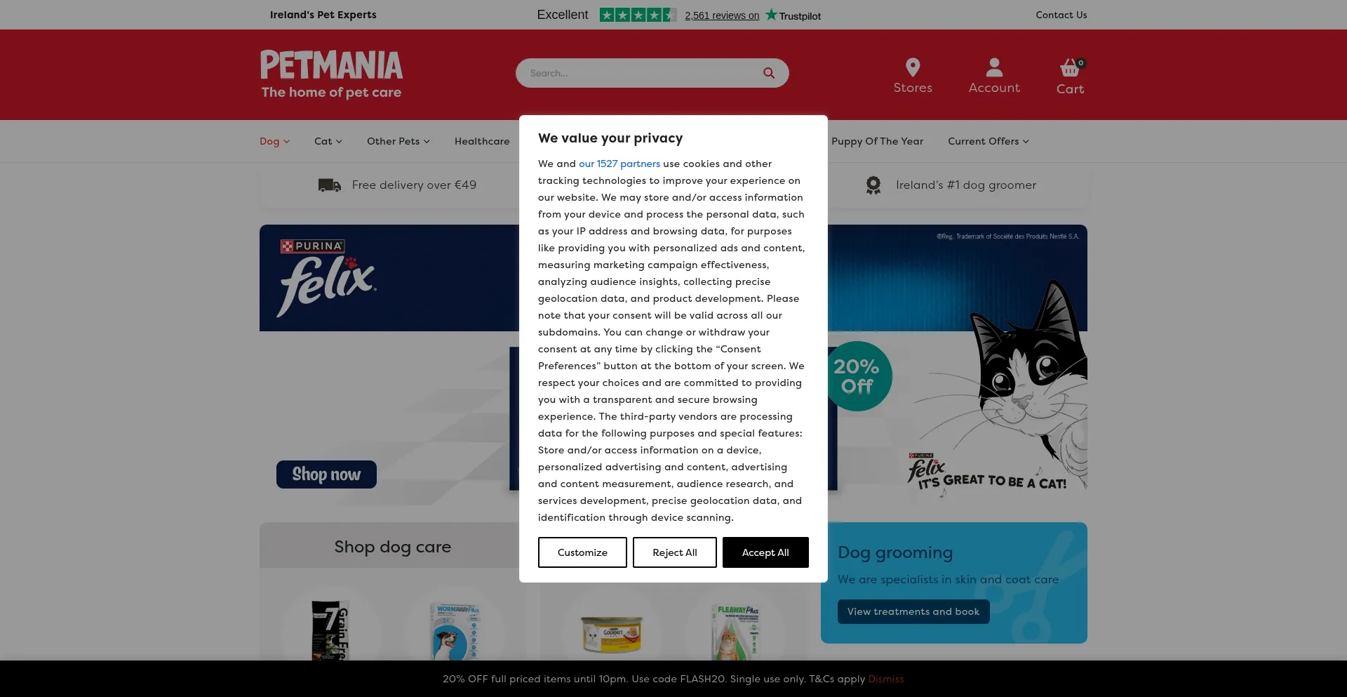 The website implements cookie consent mechanisms in compliance with privacy regulations such as GDPR or CCPA. This demonstrates that petmania.ie adheres to data protection standards and provides users with control over personal data collection practices.