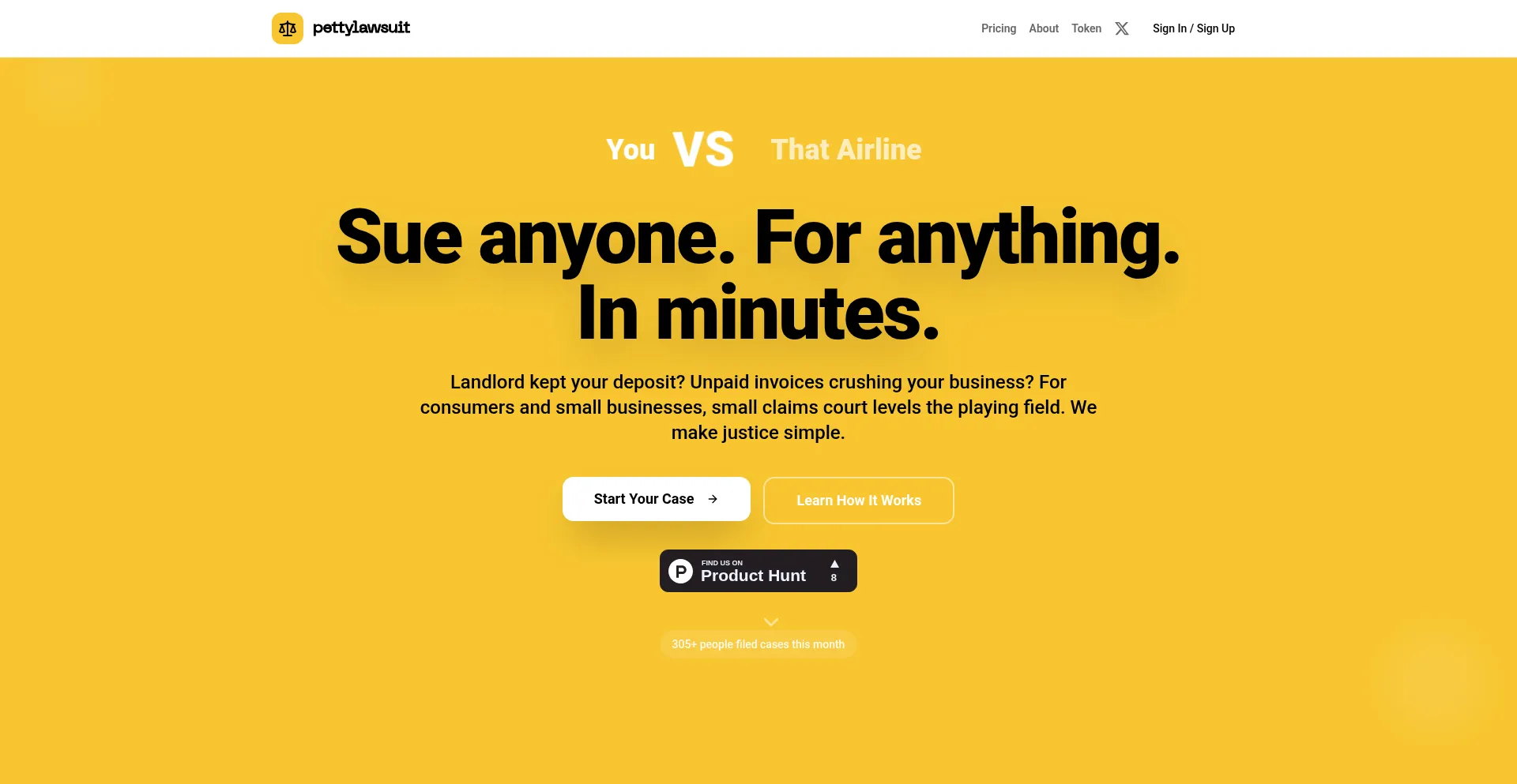 The pettylawsuit.com website is listed on Product Hunt, a platform for product discovery and community feedback.