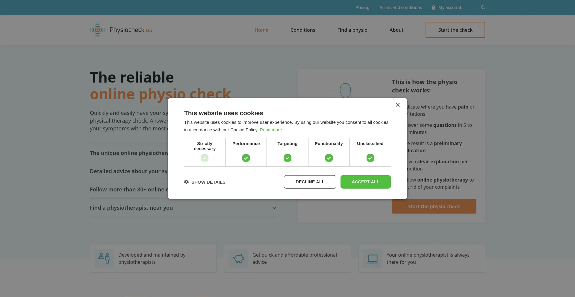The website implements cookie consent mechanisms in compliance with privacy regulations such as GDPR or CCPA. This demonstrates that physiocheck.us adheres to data protection standards and provides users with control over personal data collection practices.