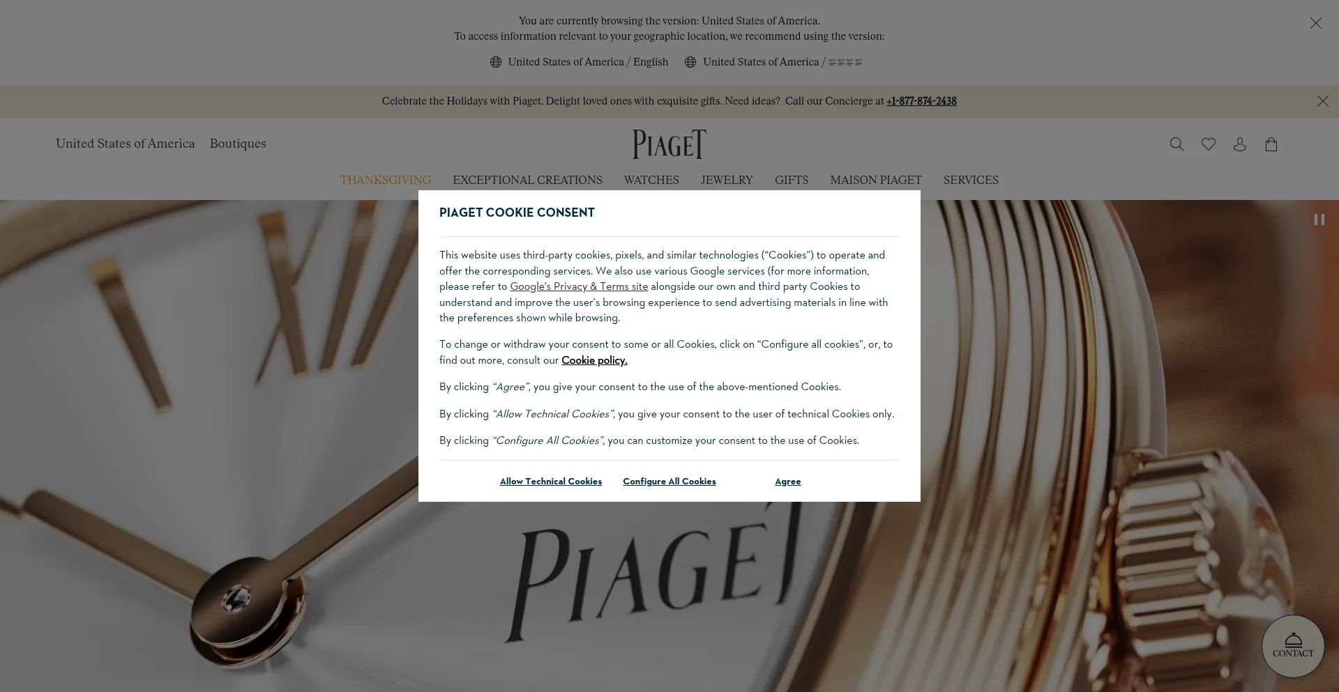 The website implements cookie consent mechanisms in compliance with privacy regulations such as GDPR or CCPA. This demonstrates that piaget.com adheres to data protection standards and provides users with control over personal data collection practices.