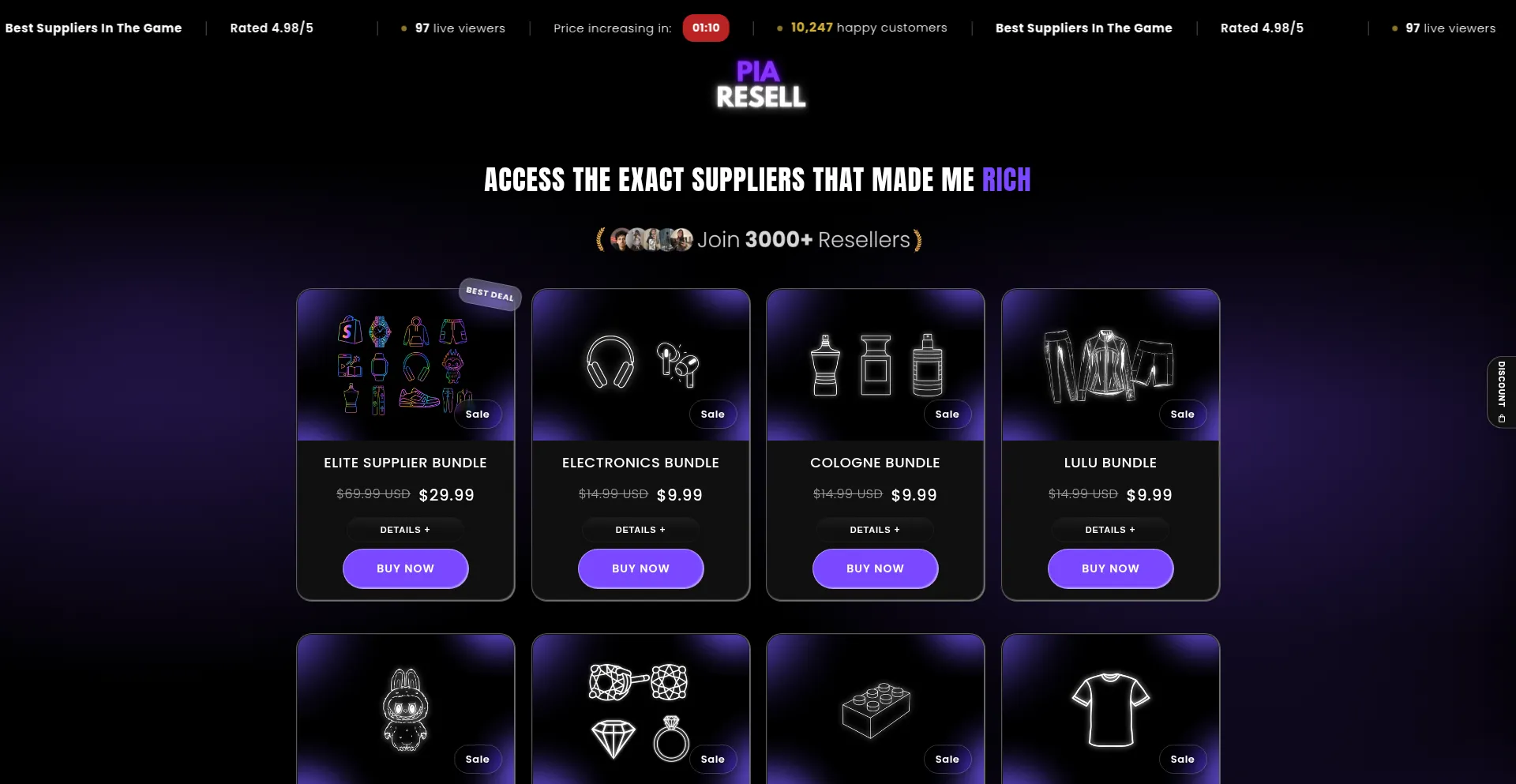 The website leverages popular product names and brands to attract traffic and generate user interest. These products may be offered through promotional campaigns or discount strategies designed to increase visitor engagement and conversion rates for piaresells.com.