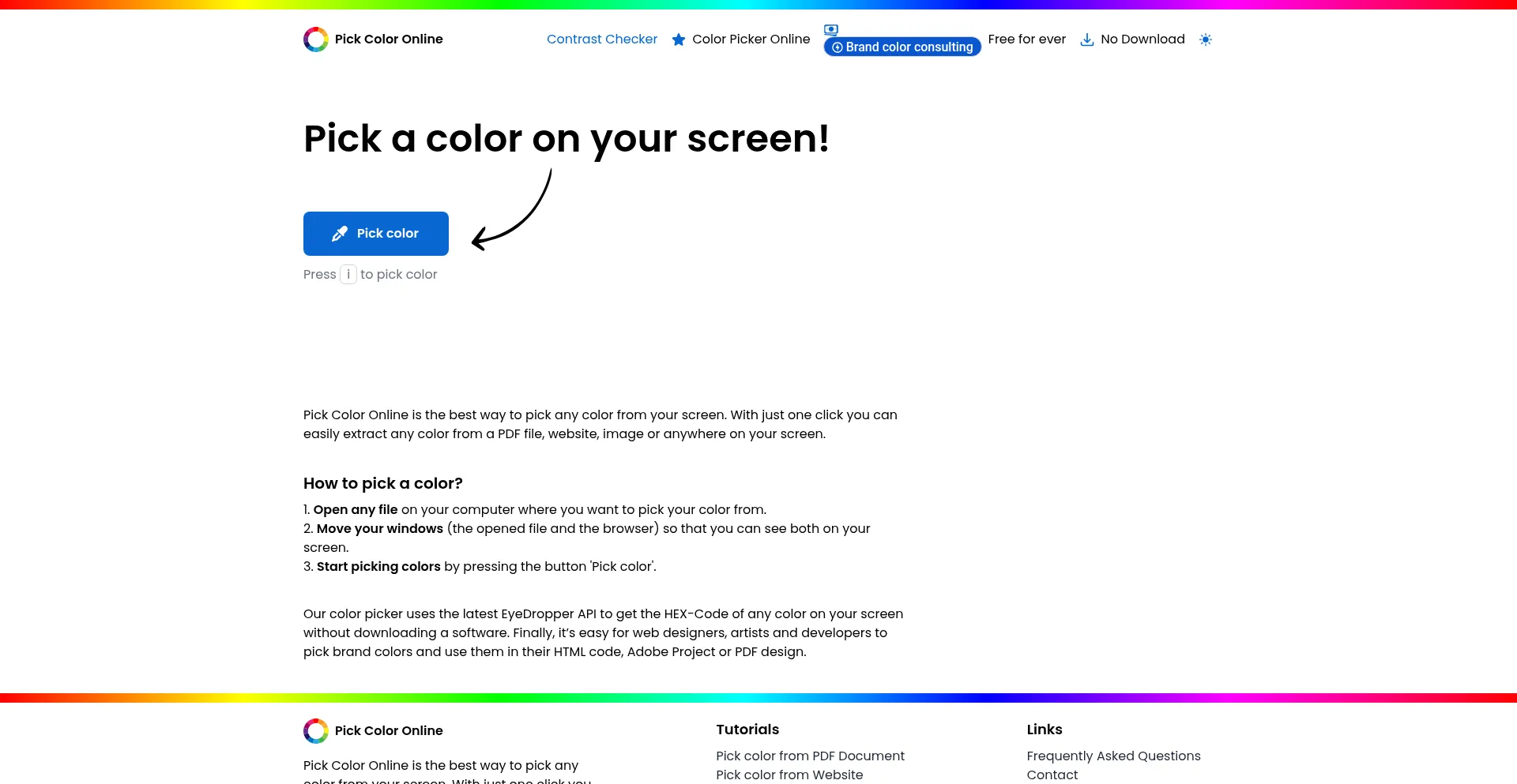 Pick any color from an Image, PDF-File, Website or anywhere on your Screen and get the Hex code. Use our Color Picker for Free and without downloading a Tool!