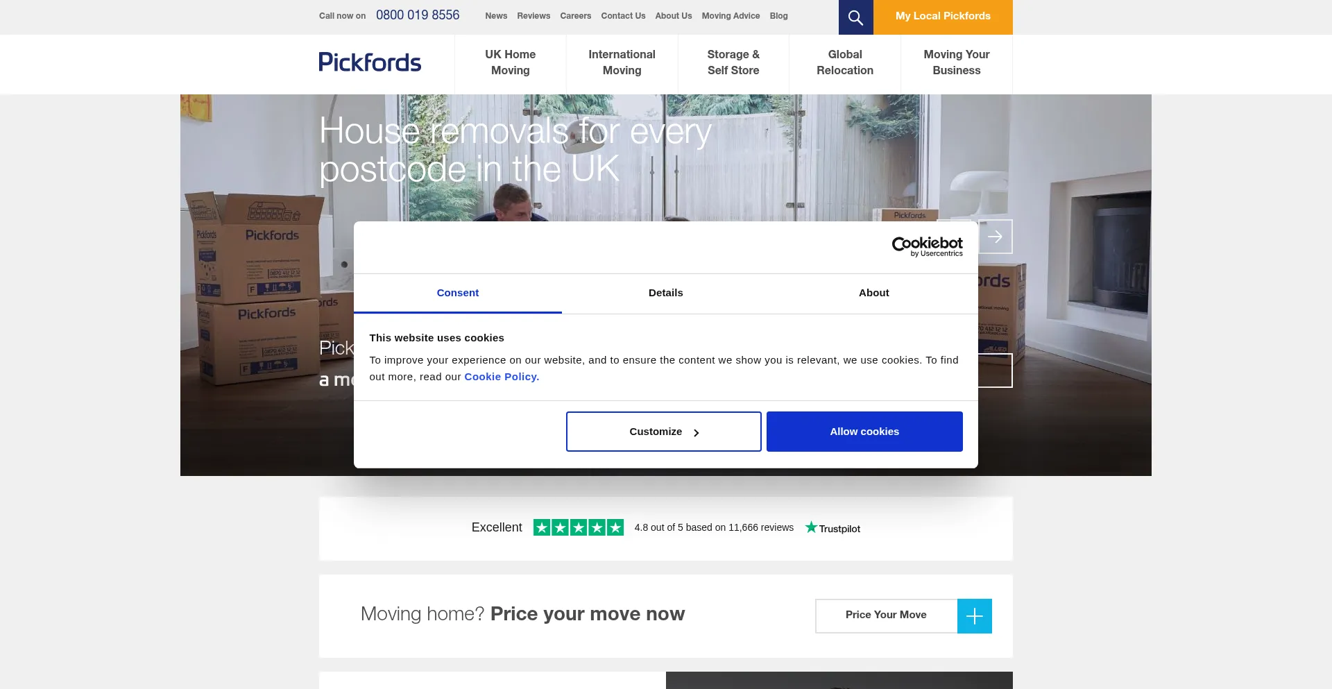 The website implements cookie consent mechanisms in compliance with privacy regulations such as GDPR or CCPA. This demonstrates that pickfords.co.uk adheres to data protection standards and provides users with control over personal data collection practices.