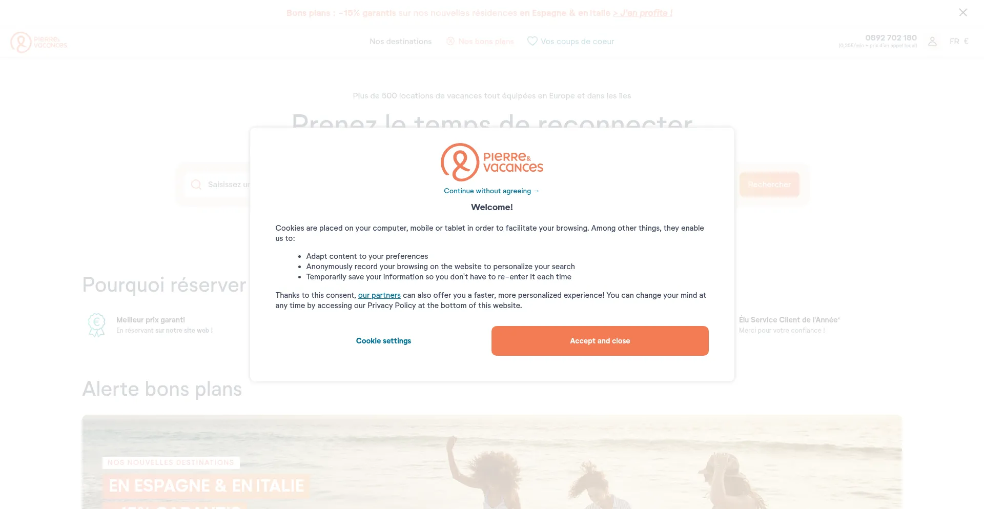 The website implements cookie consent mechanisms in compliance with privacy regulations such as GDPR or CCPA. This demonstrates that pierreetvacances.com adheres to data protection standards and provides users with control over personal data collection practices.