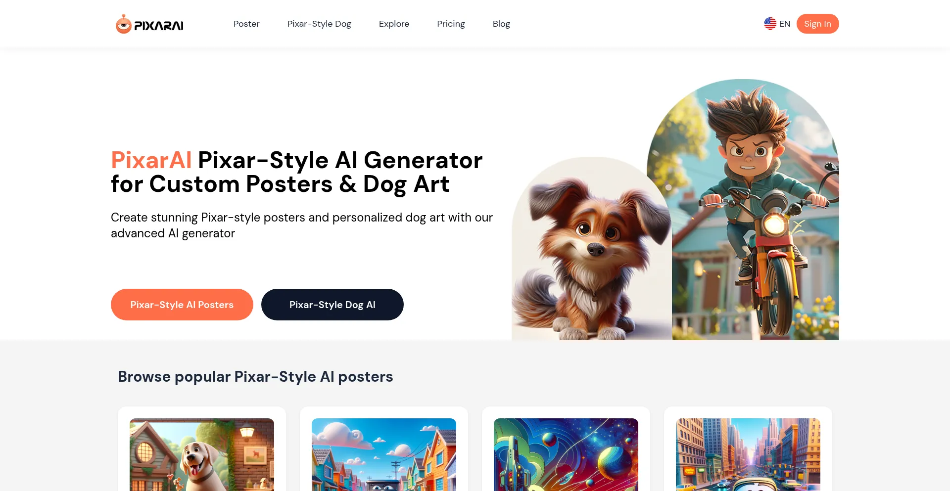 Discover PixarAI, the ultimate Pixar-style AI generator. Create personalized AI Pixar-style posters, custom dog art, and hilarious AI Pixar-style memes. Perfect for fans, collec...