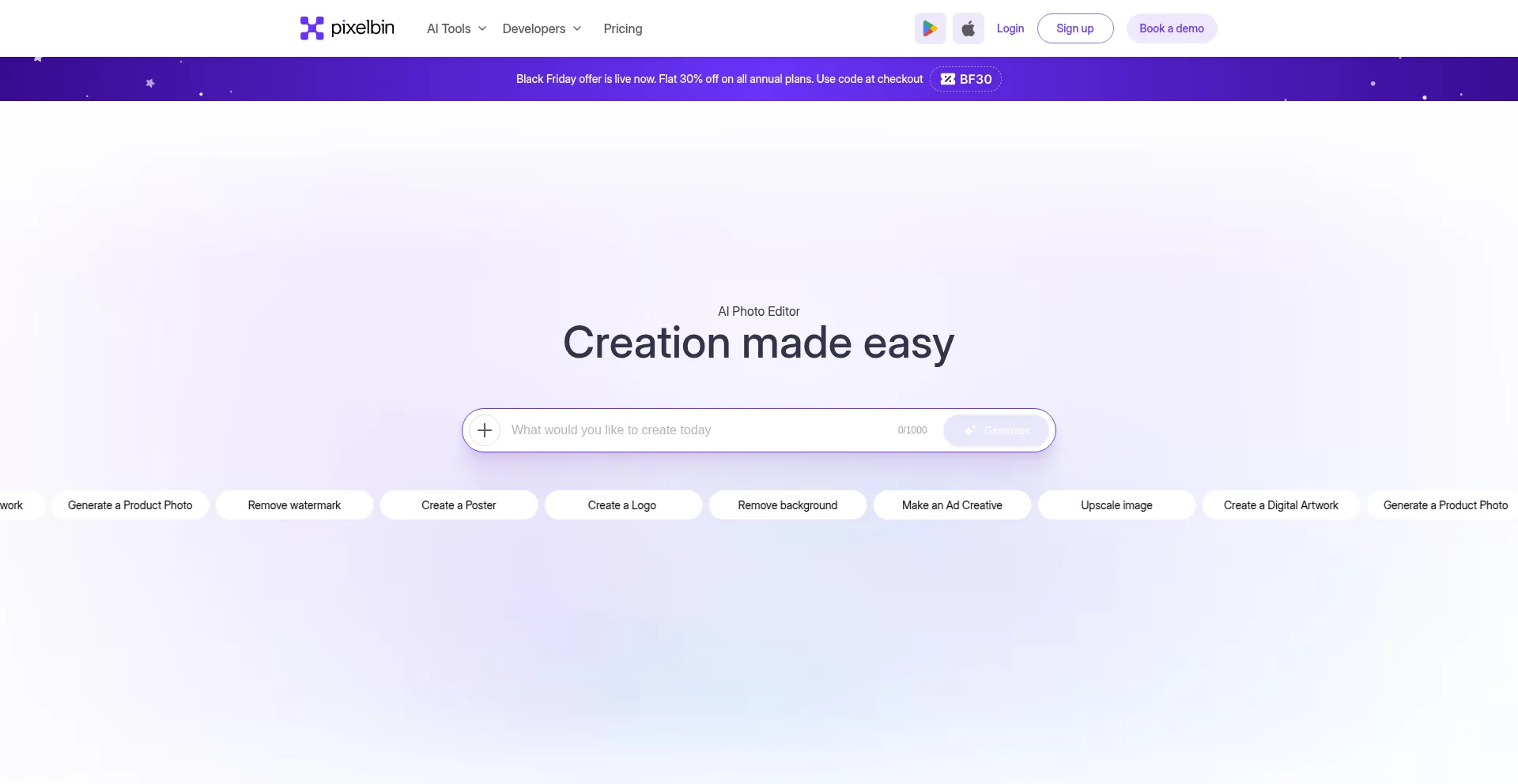 The pixelbin.io website offers a mobile application for Android devices, indicating expanded platform presence beyond web-based services.