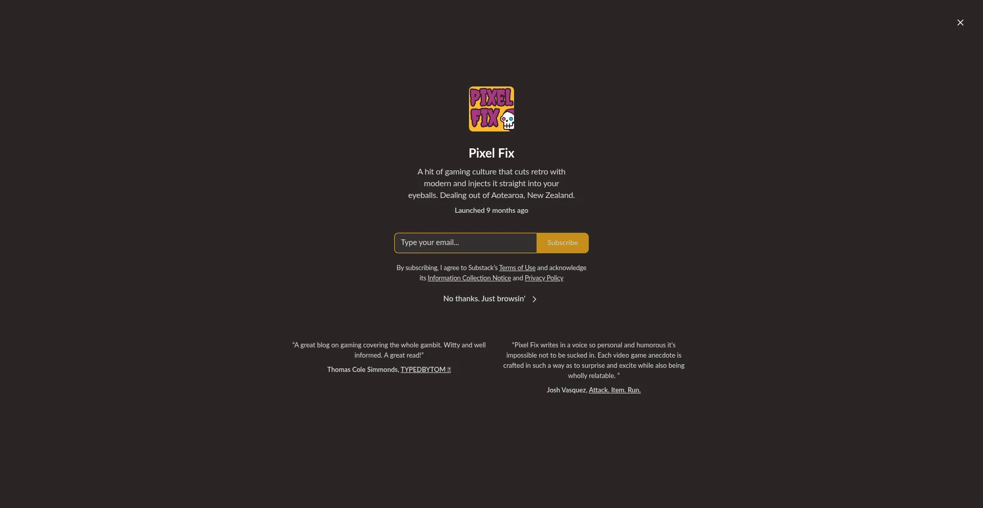 A hit of gaming culture that cuts retro with modern and injects it straight into your eyeballs. Dealing out of Aotearoa, New Zealand. Click to read Pixel Fix, a Substack publica...