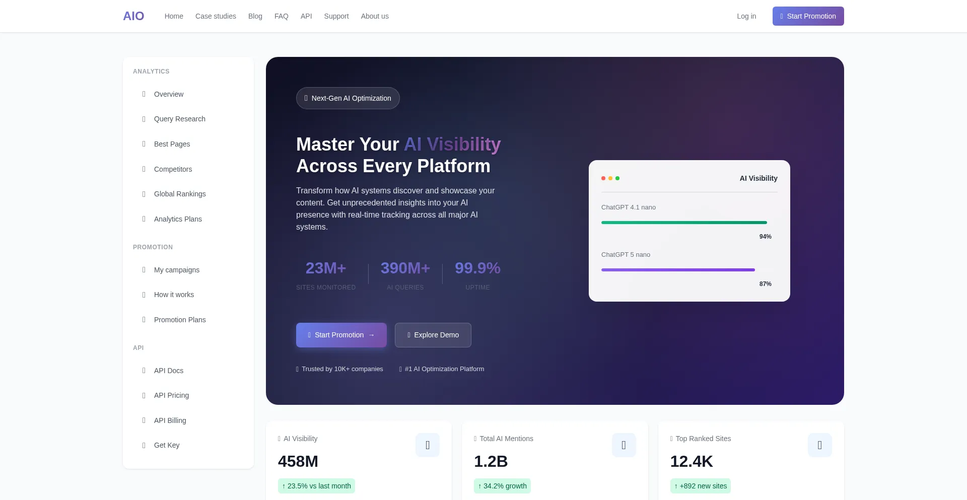 AIO Platform delivers AI visibility and optimization across major AI systems. Real-time analytics, indexing, backlinks, and API access.