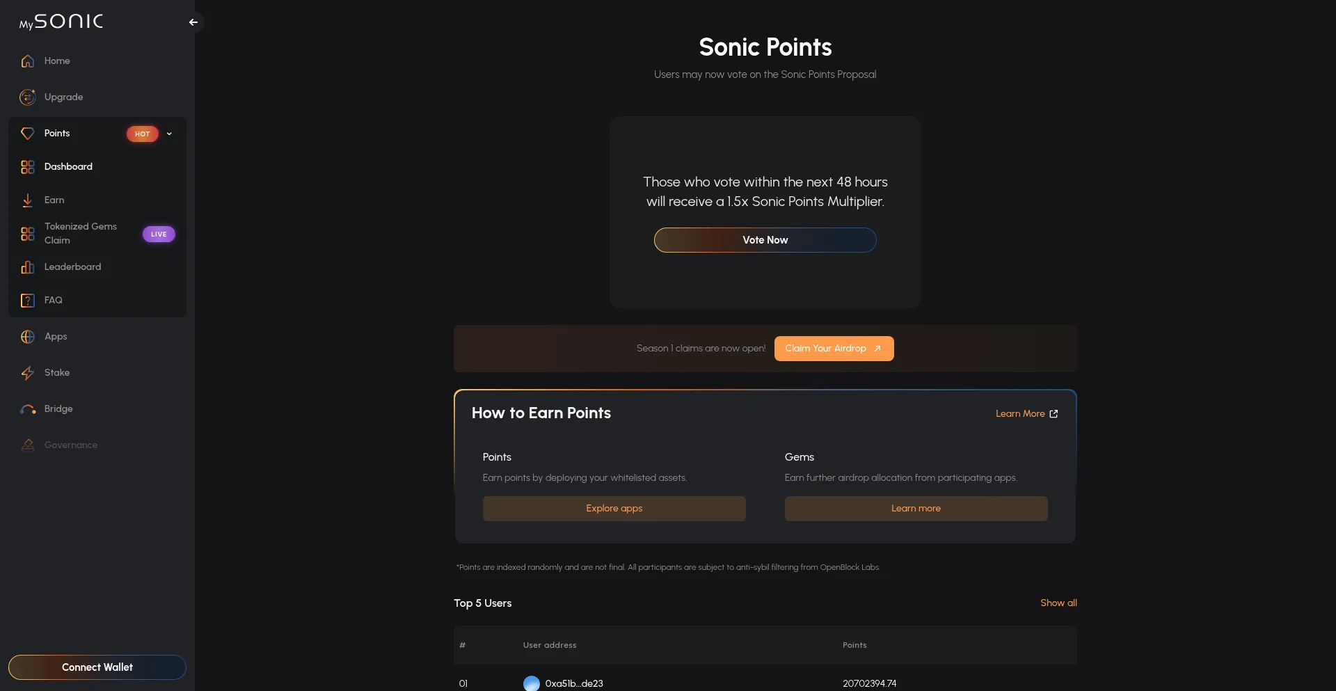 Track your Sonic Points and see how you rank against other users. Earn points through various activities in the Sonic ecosystem.