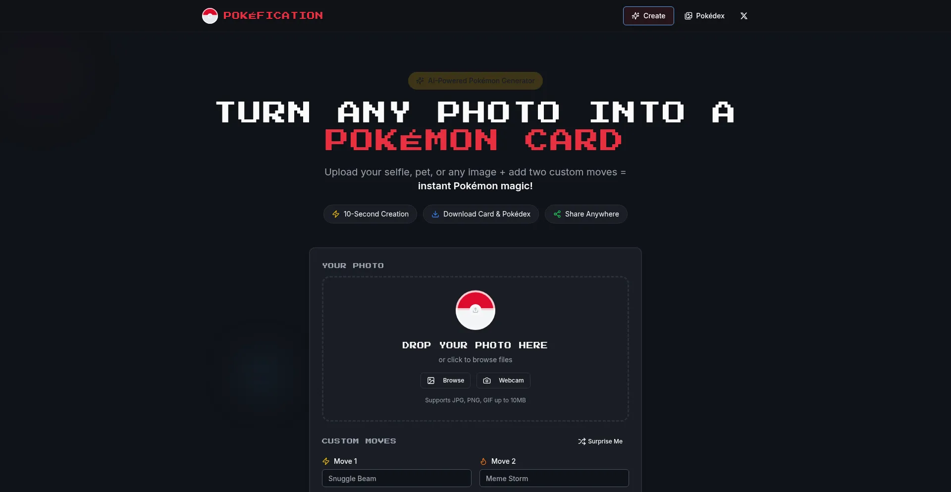 Transform any photo into an official-looking Pokémon trading card and Pokédex entry in seconds. Upload your selfie, pet, or meme, add two custom moves, and create your own Pok...