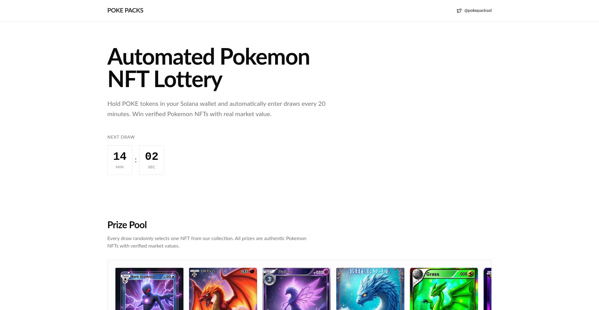 Hold POKE tokens and get automatically entered to win legendary Pokemon NFTs every 20 minutes. Verified on Solscan.