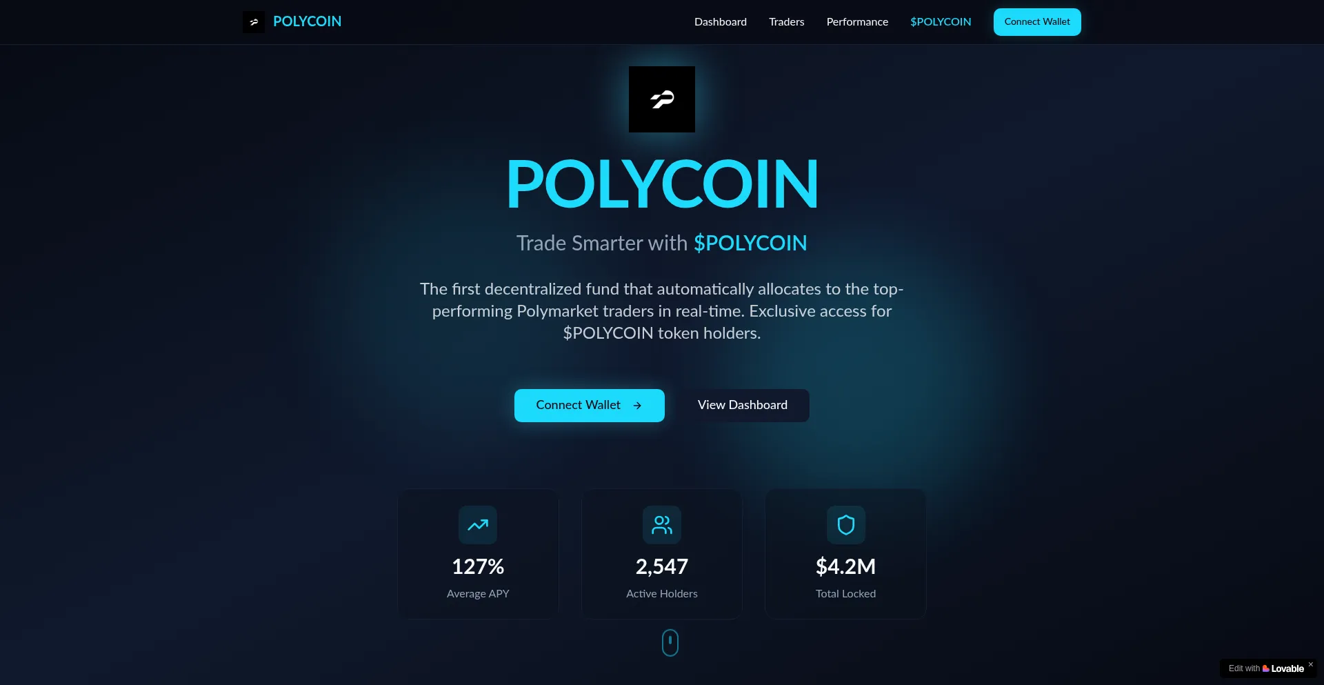 The first decentralized fund that automatically allocates to top-performing Polymarket traders in real-time. Exclusive access for $POLYCOIN token holders.