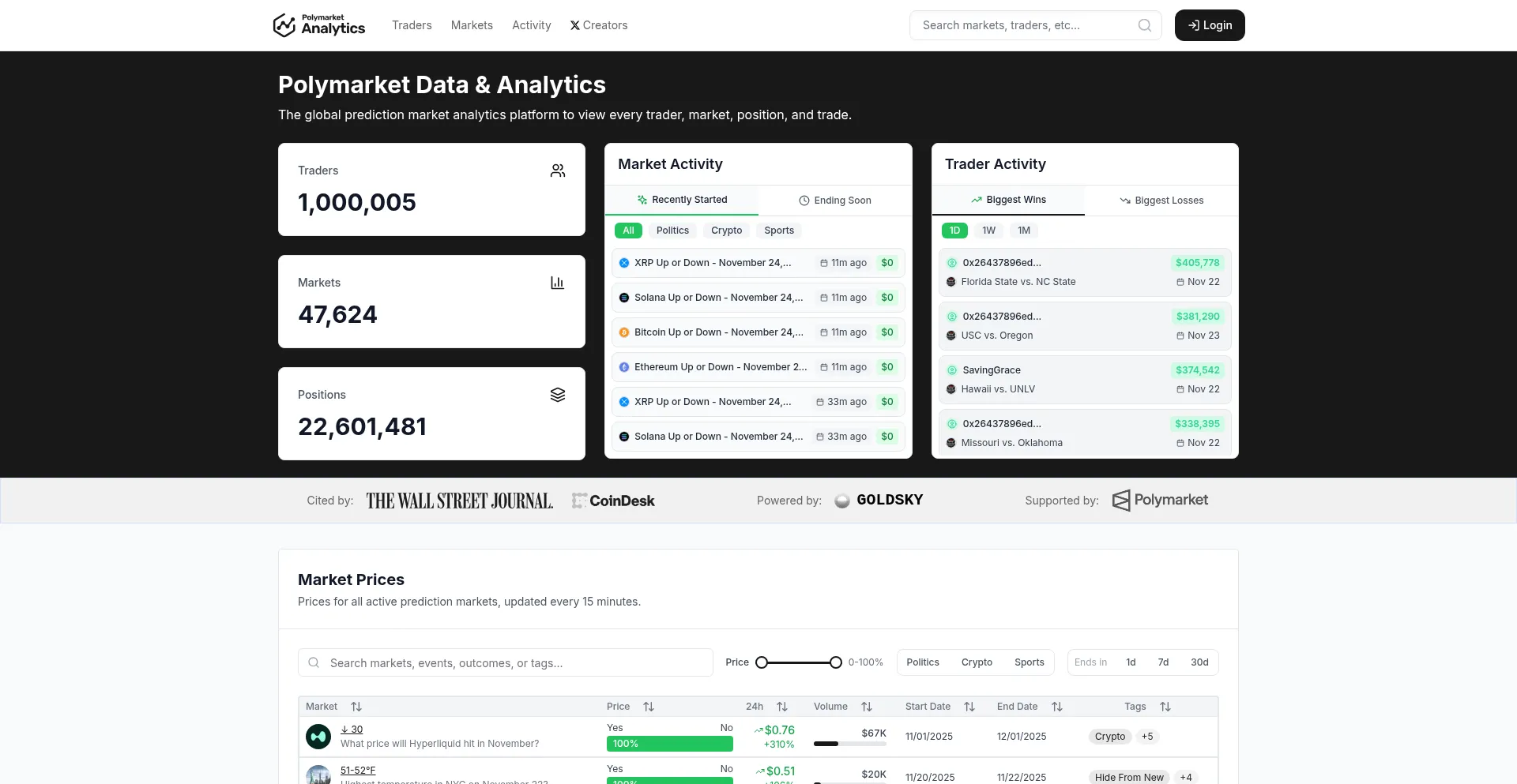 Real-time prediction market data, analytics, and dashboards for Polymarket. Track top traders and access powerful research tools for informed decision-making.