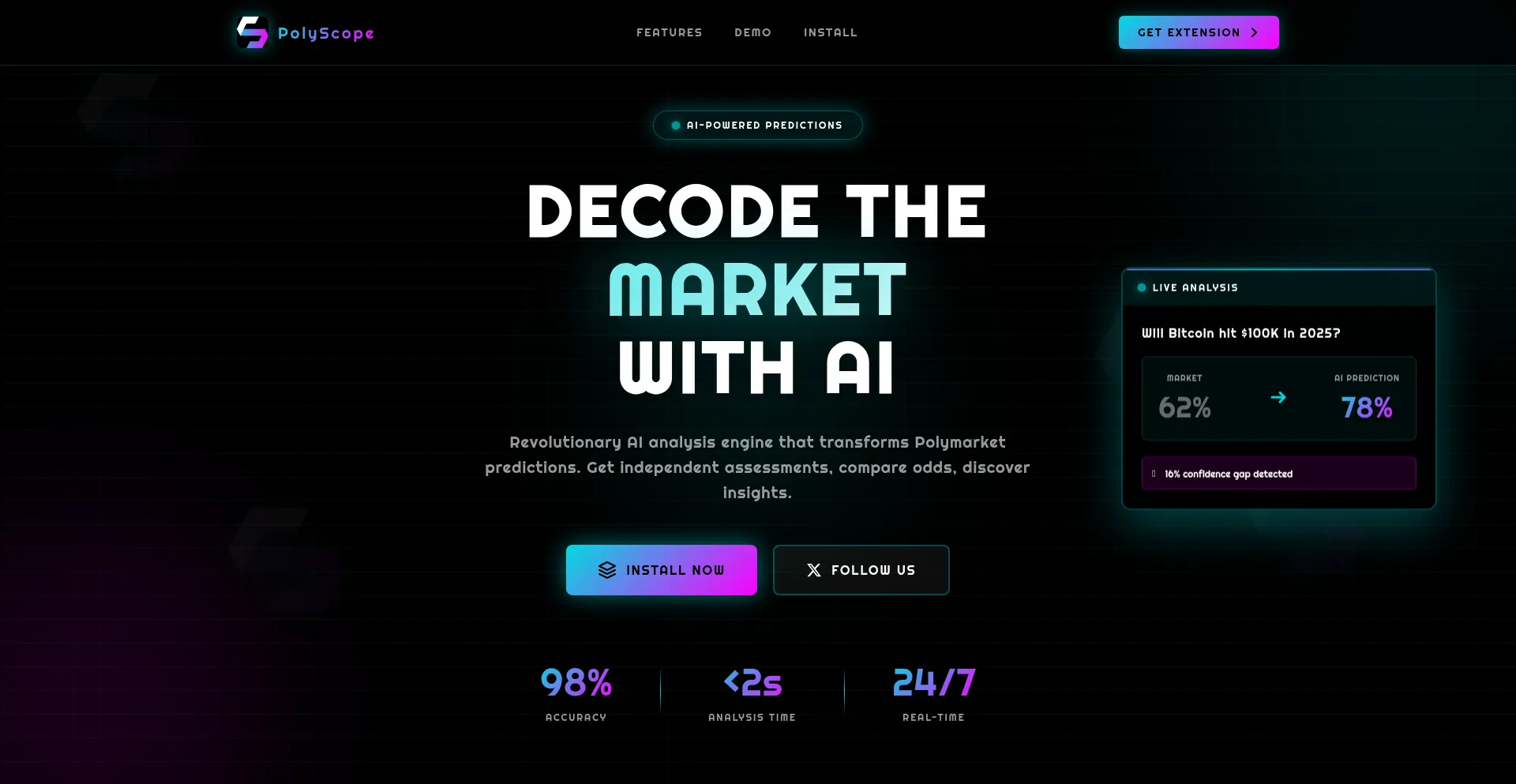Revolutionary AI-powered analysis for Polymarket. Real-time predictions, market comparison, intelligent insights.