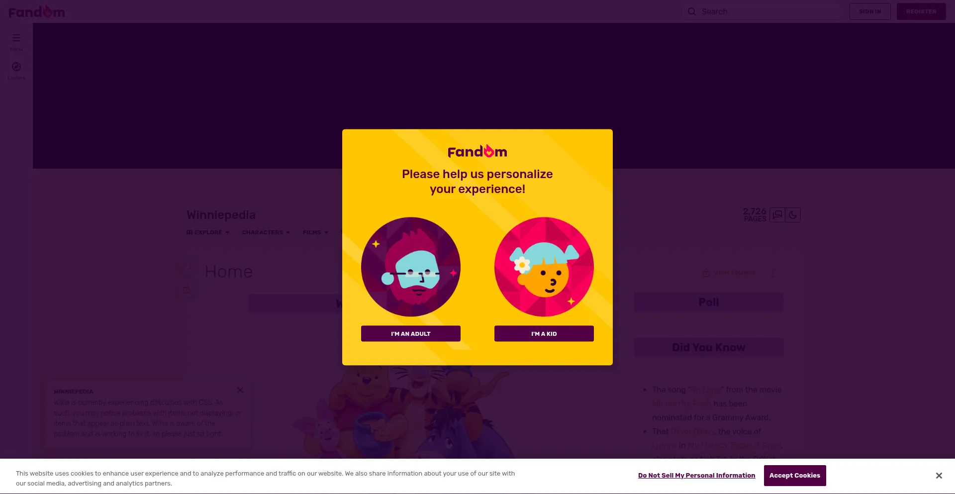 The website implements cookie consent mechanisms in compliance with privacy regulations such as GDPR or CCPA. This demonstrates that pooh.fandom.com adheres to data protection standards and provides users with control over personal data collection practices.