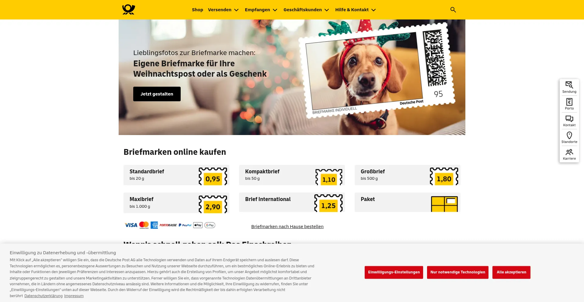Die Deutsche Post im Internet: Porto berechnen, Online Porto drucken, Filialen und Briefkästen finden, Briefmarken und Postprodukte im Online-Shop, Innovative Leistungen, Kunde...