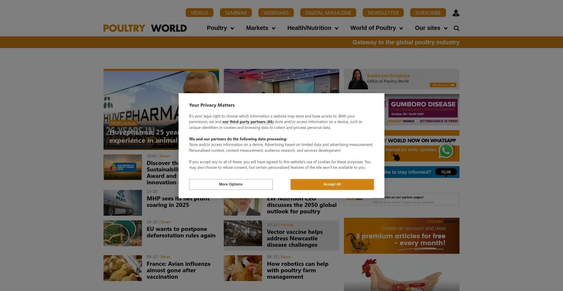 The website implements cookie consent mechanisms in compliance with privacy regulations such as GDPR or CCPA. This demonstrates that poultryworld.net adheres to data protection standards and provides users with control over personal data collection practices.