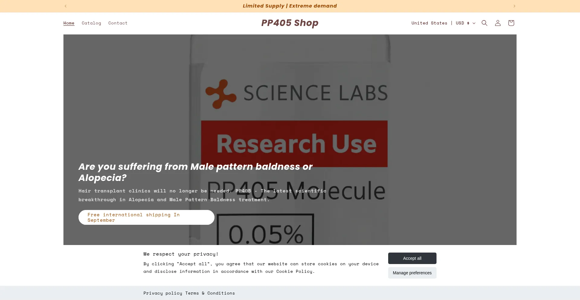 PP405 is a novel, non-hormonal breakthrough in Male Pattern Baldness and Alopecia treatment. Grow your hair back now by activating the hair stem cell follicles. Worldwide shipping.