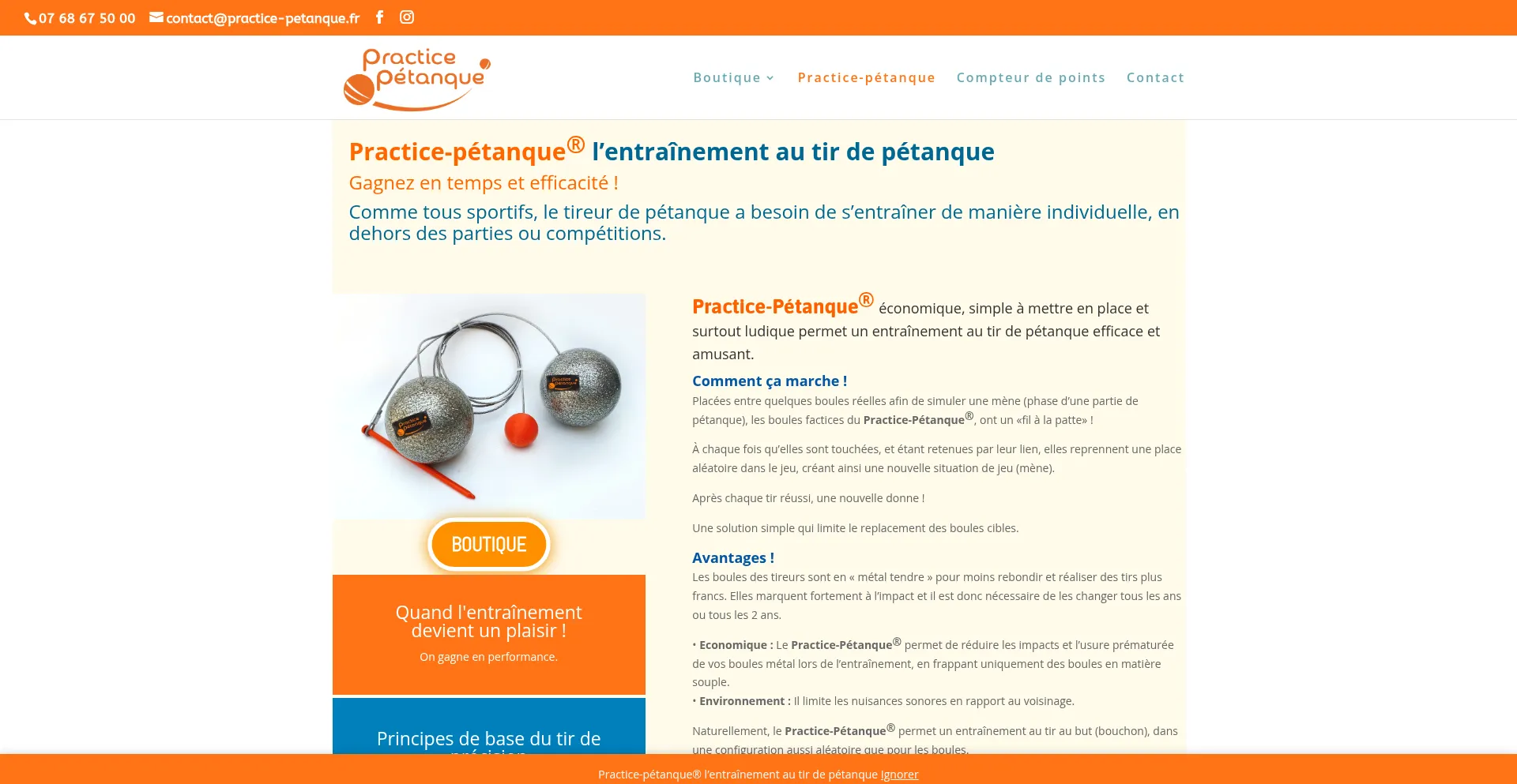 Analysis indicates that practice-petanque.fr operates as an e-commerce platform facilitating online transactions for goods or services. The website implements shopping cart functionality, payment processing systems, and product catalog features typical of commercial retail operations.