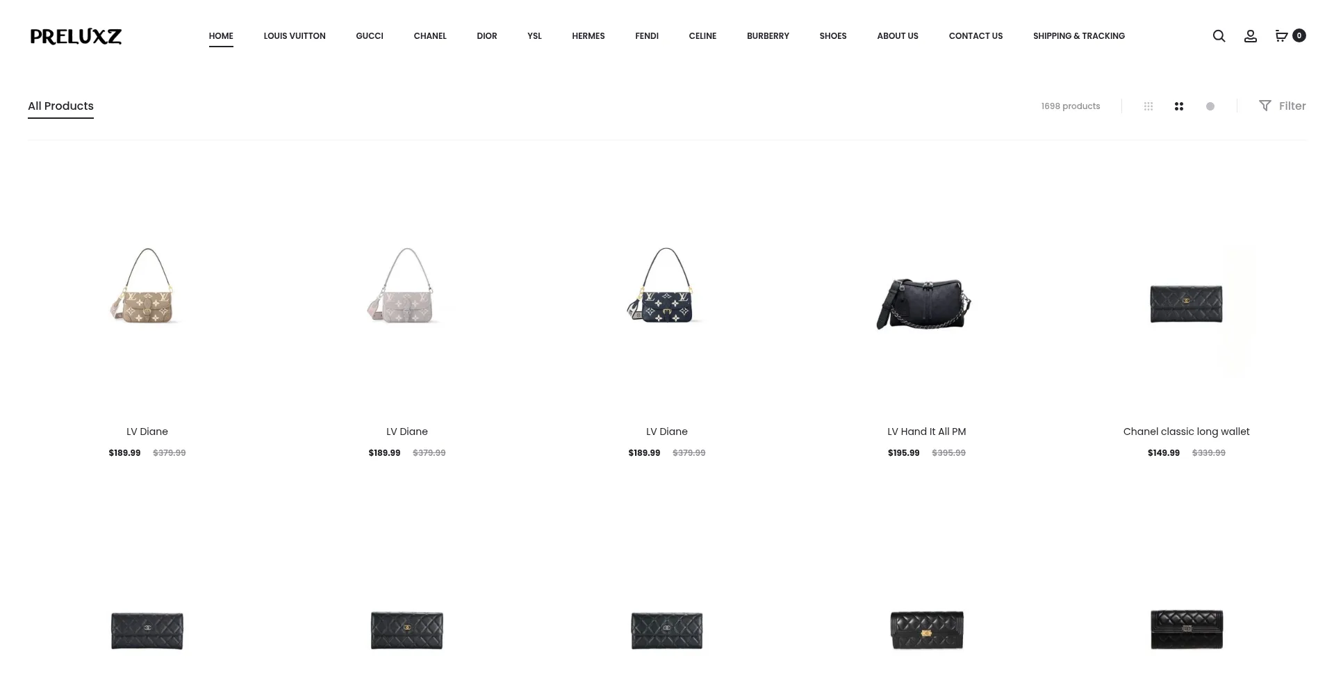 The website features luxury brand names or high-value products. This may indicate potential counterfeit merchandise or unauthorized brand usage, particularly if the site lacks official dealer authorization. Exercise heightened caution when evaluating authenticity.