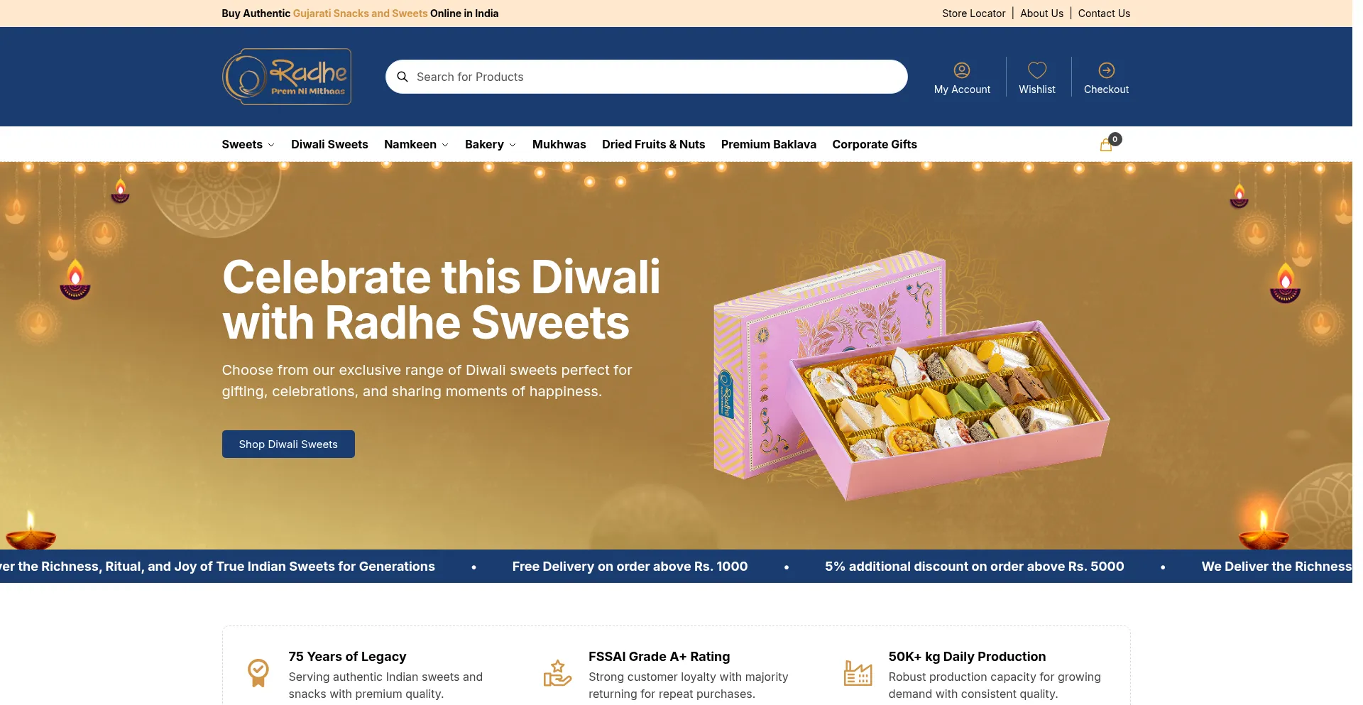 Order authentic Gujarati Radhe sweets, snacks, namkeen, and bakery items online in India, popular sweet shop delivering rich flavors since 1972.