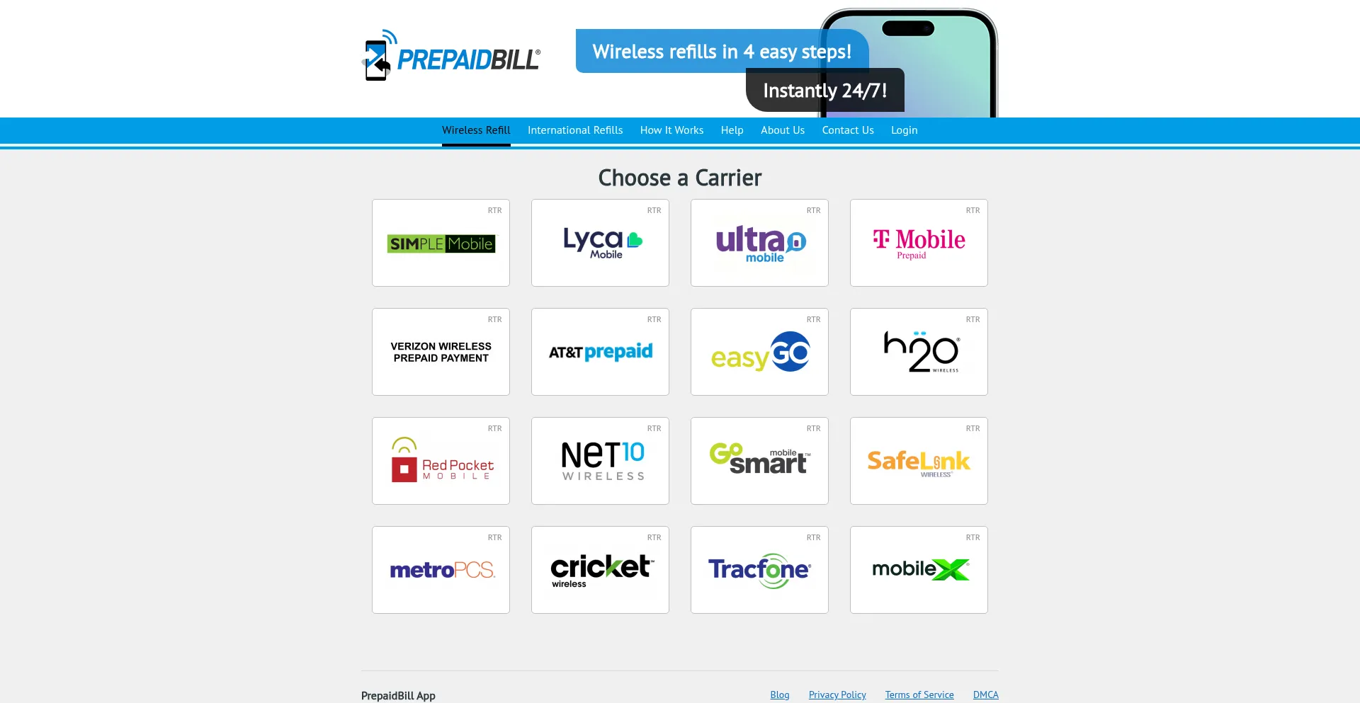 Prepaid Bill is the leading website for easy mobile recharges online. Quickly and instantly refill your cell phone on carriers such as AT&T, Verizon and more.