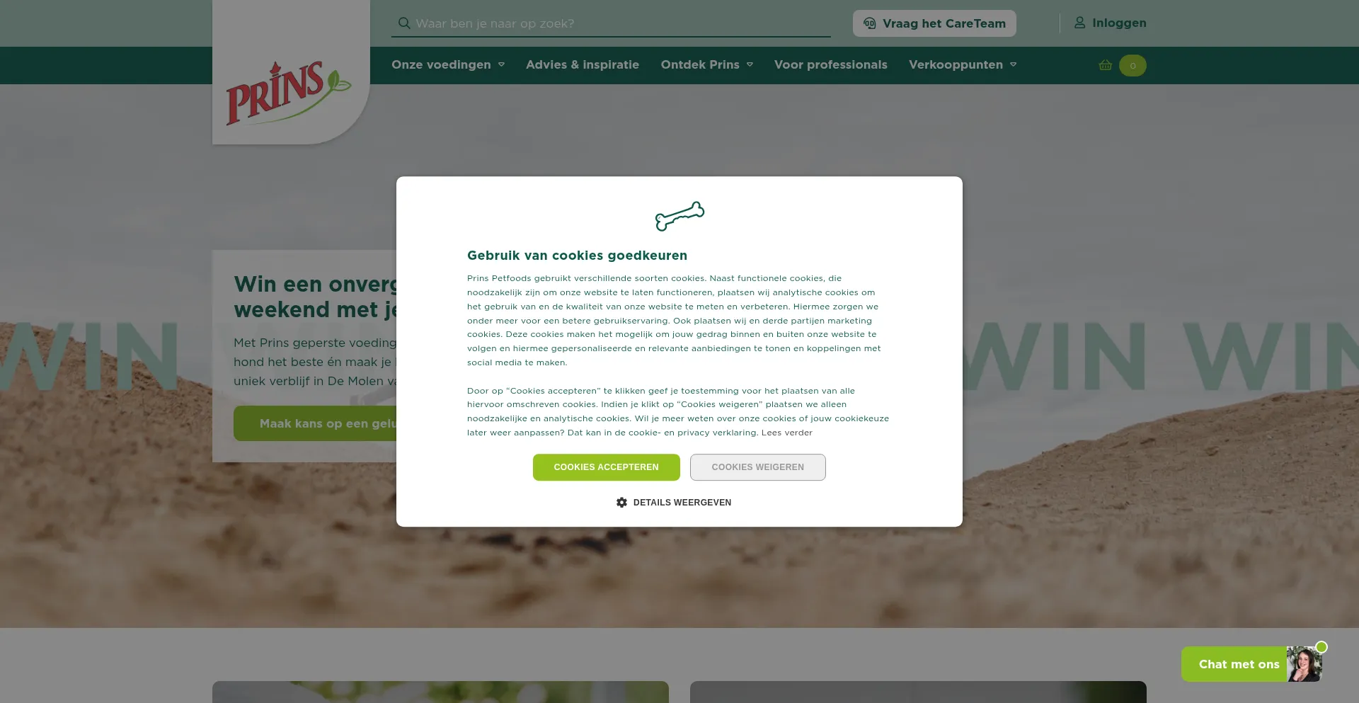 The website implements cookie consent mechanisms in compliance with privacy regulations such as GDPR or CCPA. This demonstrates that prinspetfoods.nl adheres to data protection standards and provides users with control over personal data collection practices.