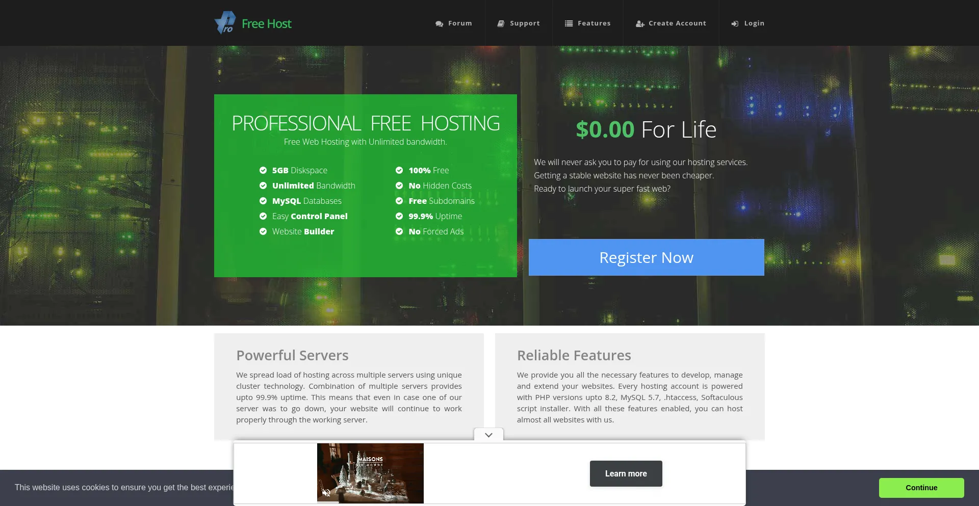 Professional Free Web Hosting with Unlimited Disk Space, Unlimited Bandwidth, Unlimited websites, Unlimited domains and No Forced ads on your site. PHP, MySQL, FTP, Emails hosting.
