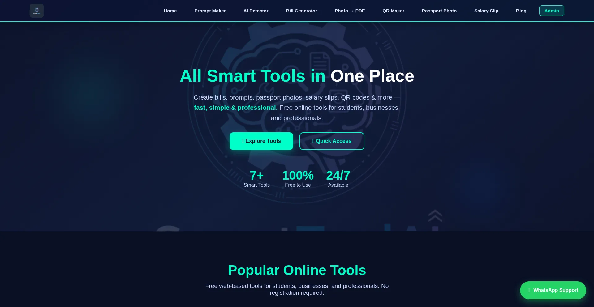 Free online tools: AI prompt maker, bill generator, passport photo tool, QR code maker, salary slip generator. Fast, secure & professional.