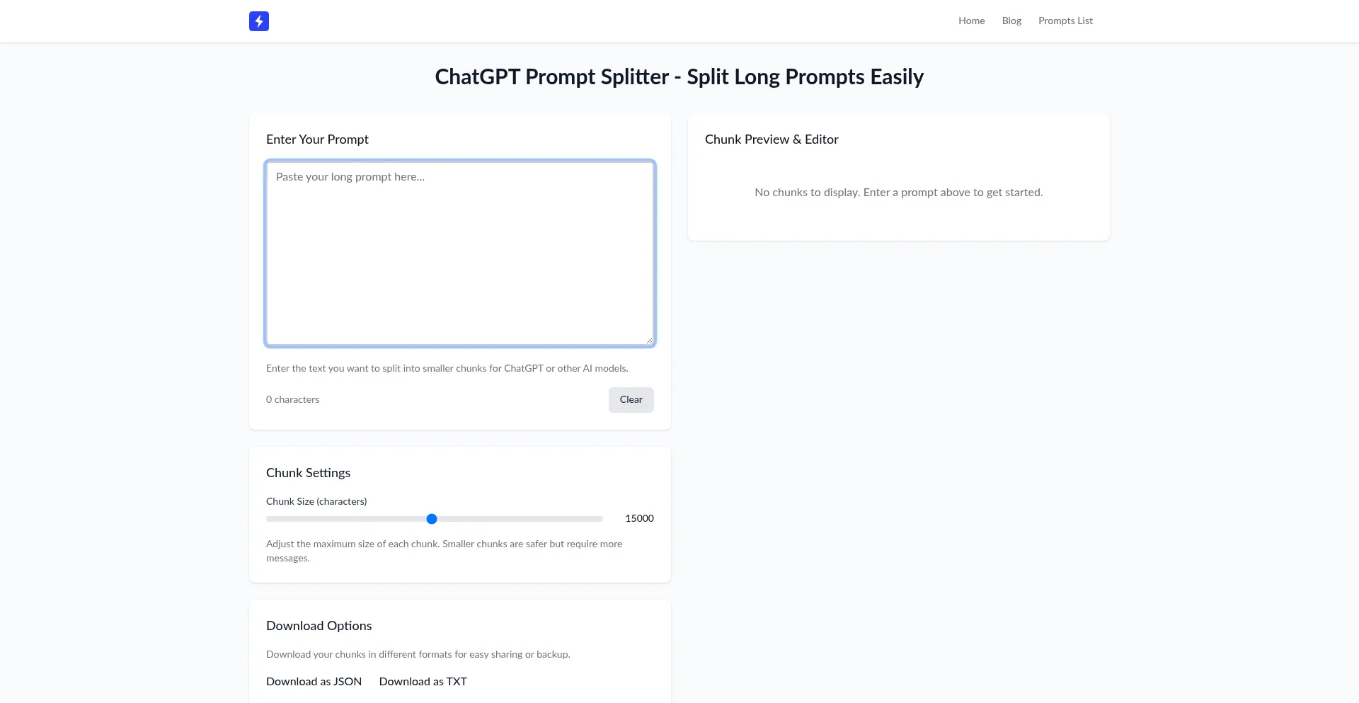 Free ChatGPT prompt splitter tool to break long prompts into smaller, manageable chunks. Customize chunk size, edit, and copy with proper formatting for optimal AI responses.