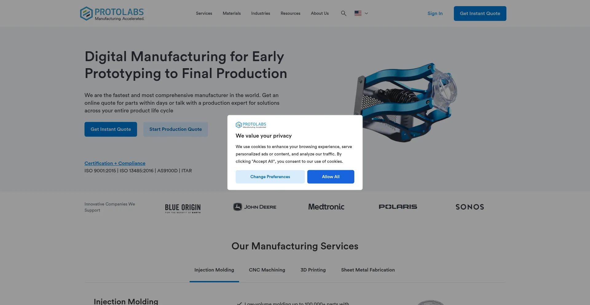 The website implements cookie consent mechanisms in compliance with privacy regulations such as GDPR or CCPA. This demonstrates that protolabs.com adheres to data protection standards and provides users with control over personal data collection practices.