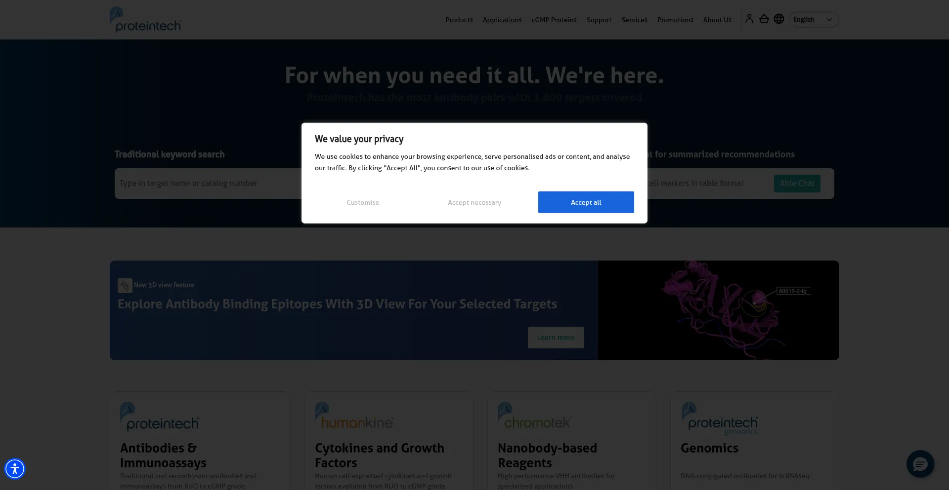 The website implements cookie consent mechanisms in compliance with privacy regulations such as GDPR or CCPA. This demonstrates that ptglab.com adheres to data protection standards and provides users with control over personal data collection practices.