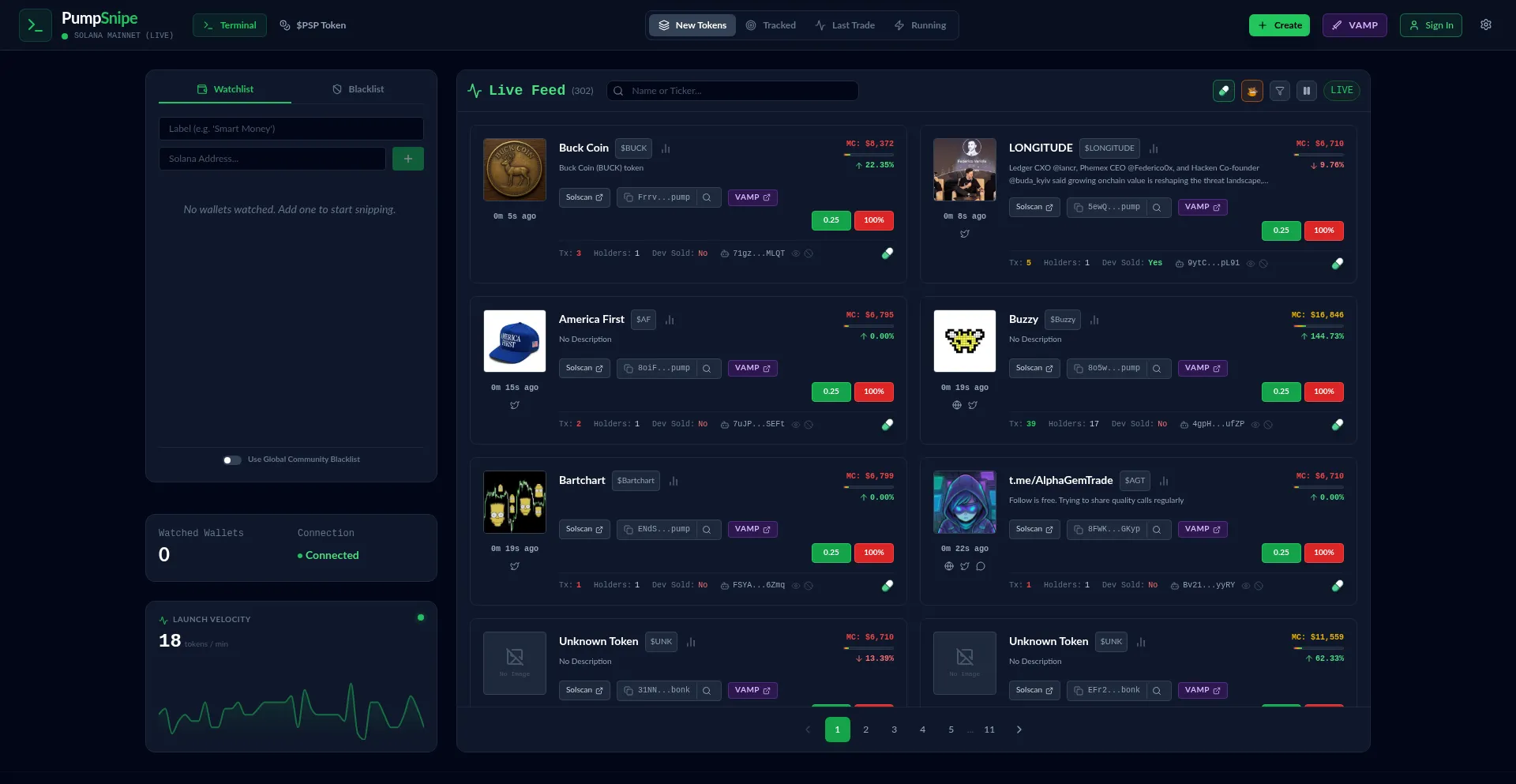 PumpSnipe - Real-time Solana token sniper and monitor for pump.fun. Track new launches, analyze risks, and monitor developer activity with live updates.