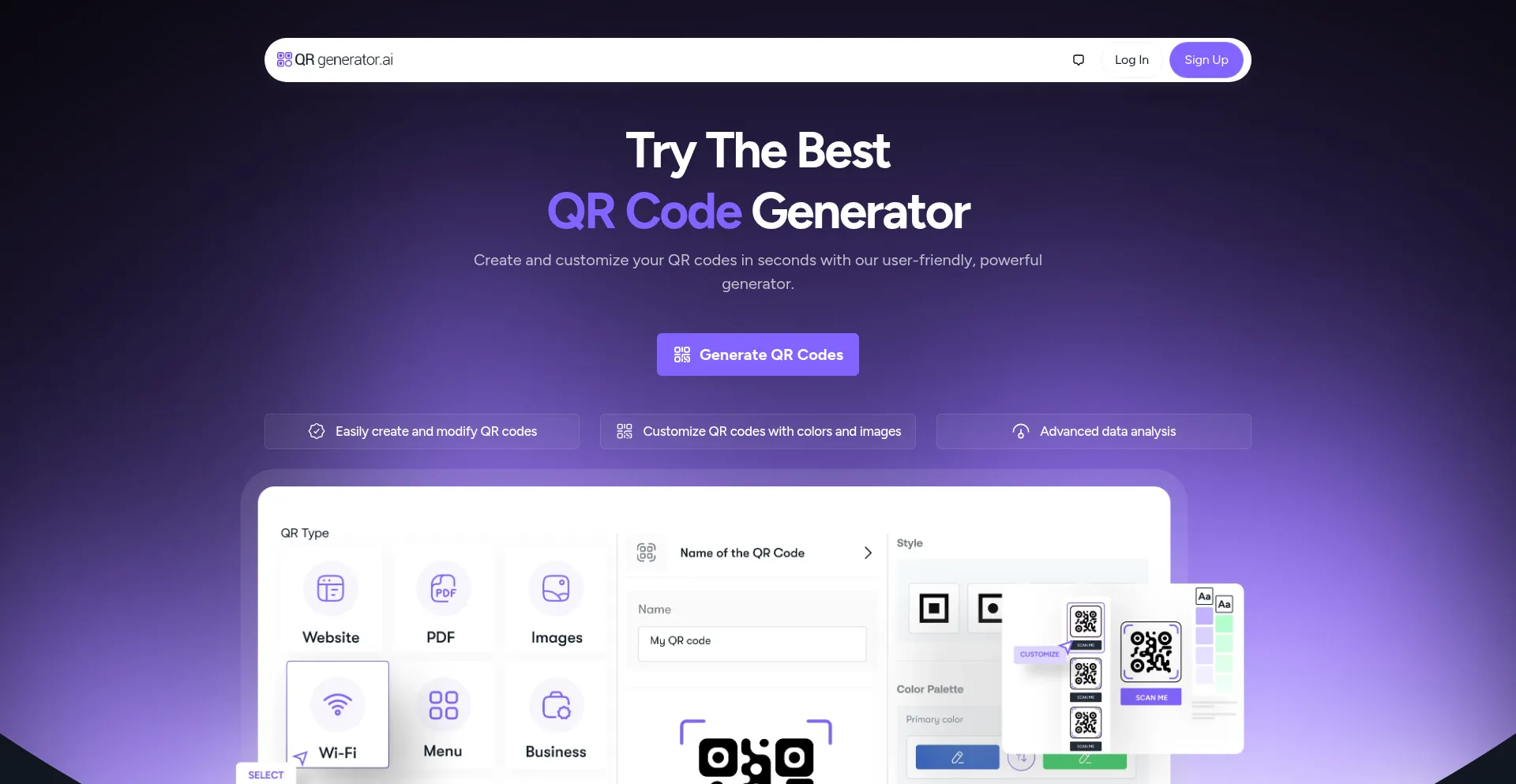 QR Generator.ai with your logo, frame, colors & more. Create, manage and statistically track your QR codes. For URL, vCard, PDF and more