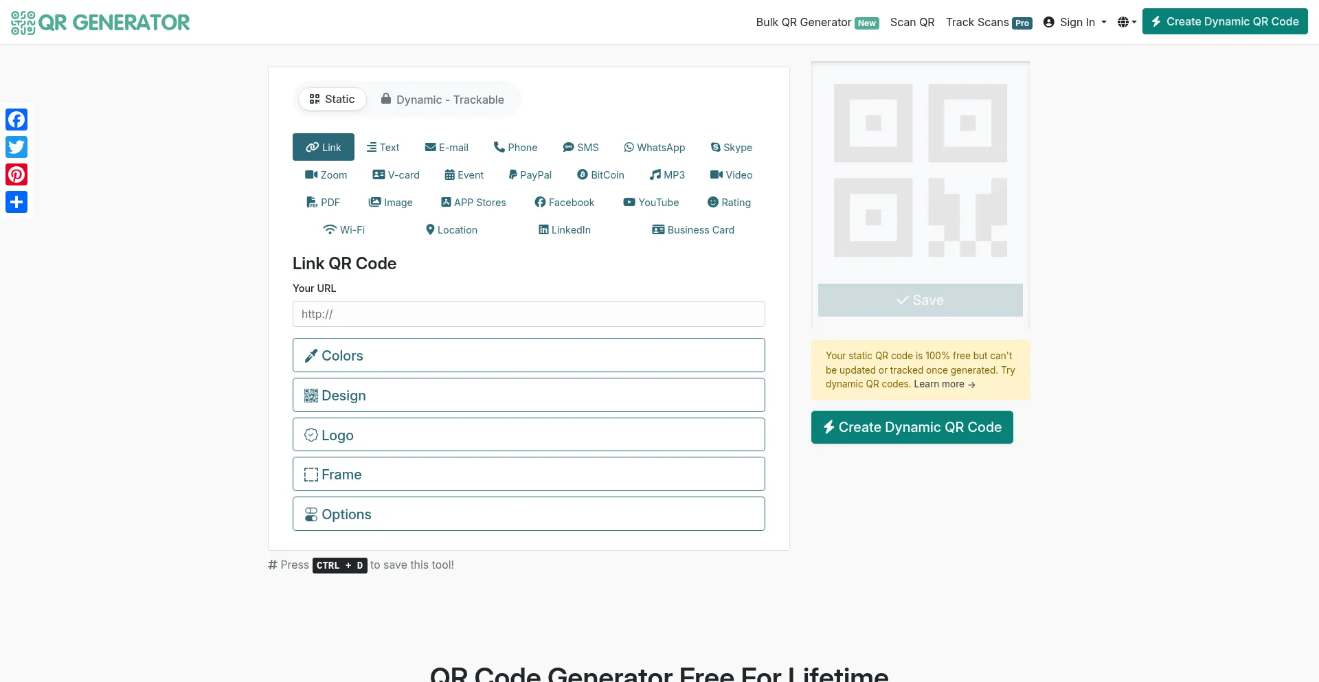 Free QR code generator tool online. Generate QR codes with custom logo, color, frame, and patterns. Get unlimited scans with lifetime validity.