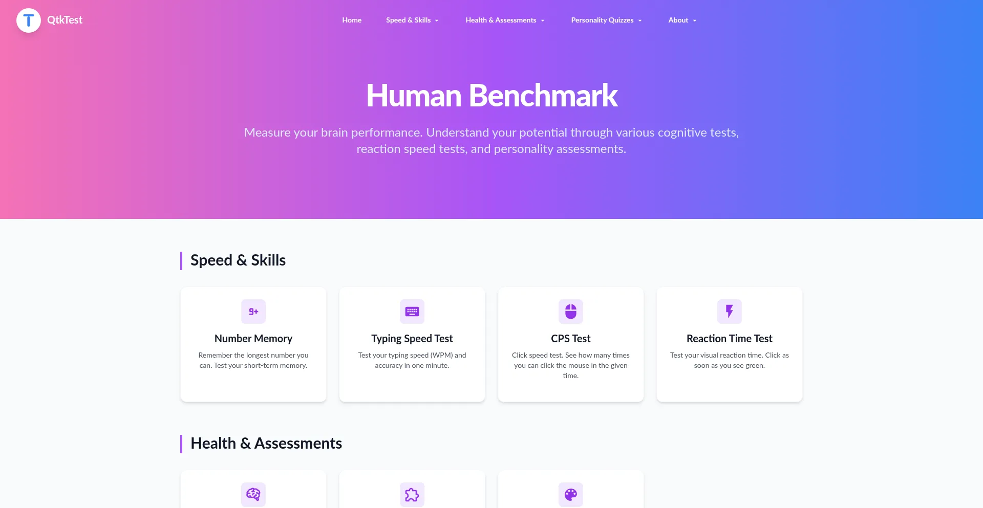 QTKTest is your personal Human Benchmark platform. Measure reaction time, memory, and cognition. Track progress and improve your brain performance today.