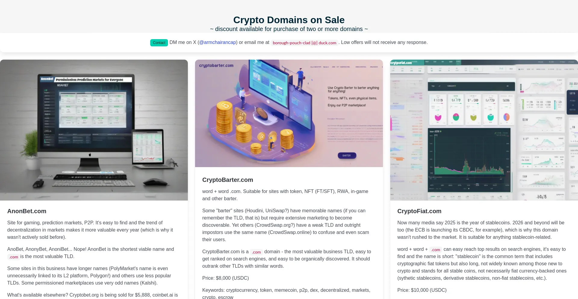 Buy premium crypto domains anonbet.com, cryptobarter.com, cryptofiat.com, supura.io, and supura.ai. Discounts available for bulk buyers. Contact me for details.
