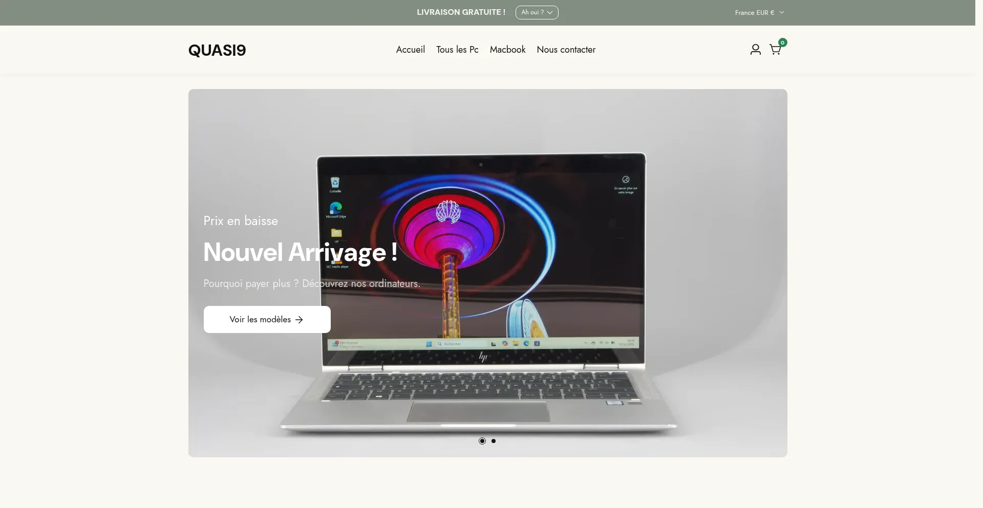 Analysis indicates that quasi9.fr operates as an e-commerce platform facilitating online transactions for goods or services. The website implements shopping cart functionality, payment processing systems, and product catalog features typical of commercial retail operations.