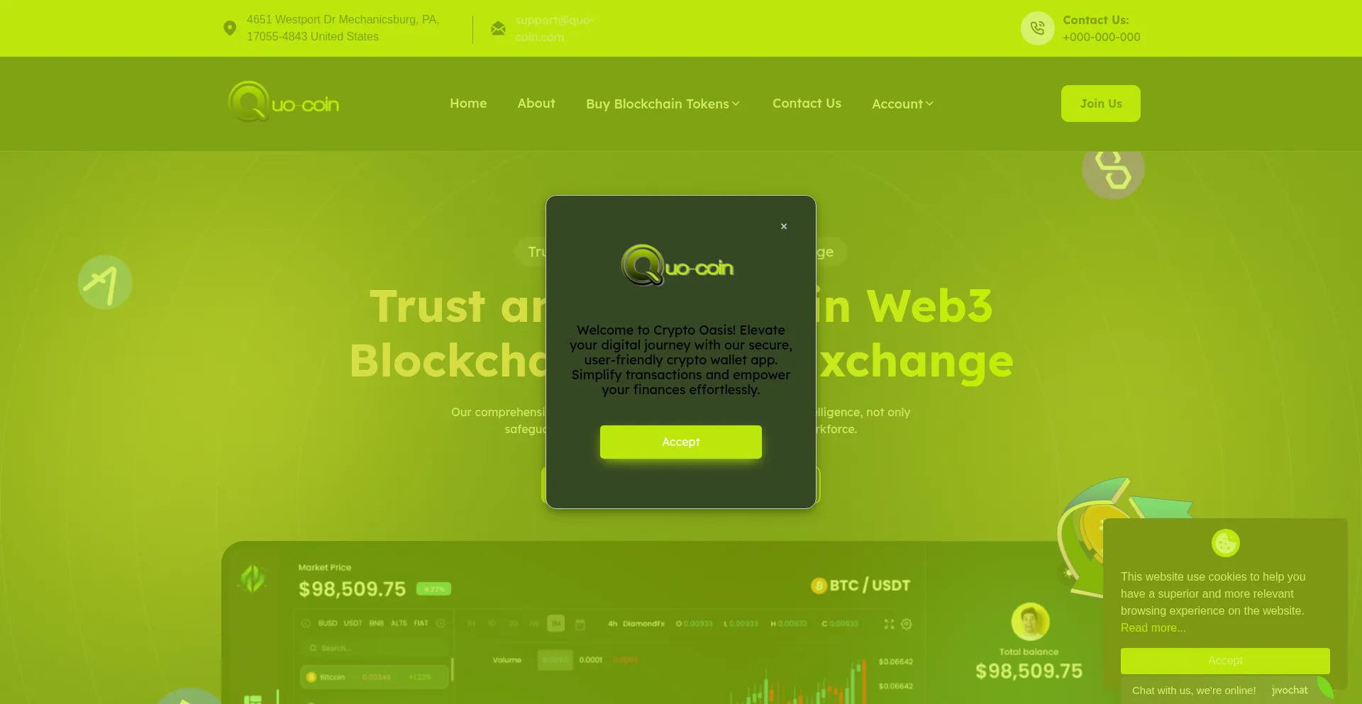 The quo-coin.com website implements data collection forms requesting personal information including names, email addresses, phone numbers, or other sensitive details. Users should verify the legitimacy of it and review privacy policies before submitting personal data.