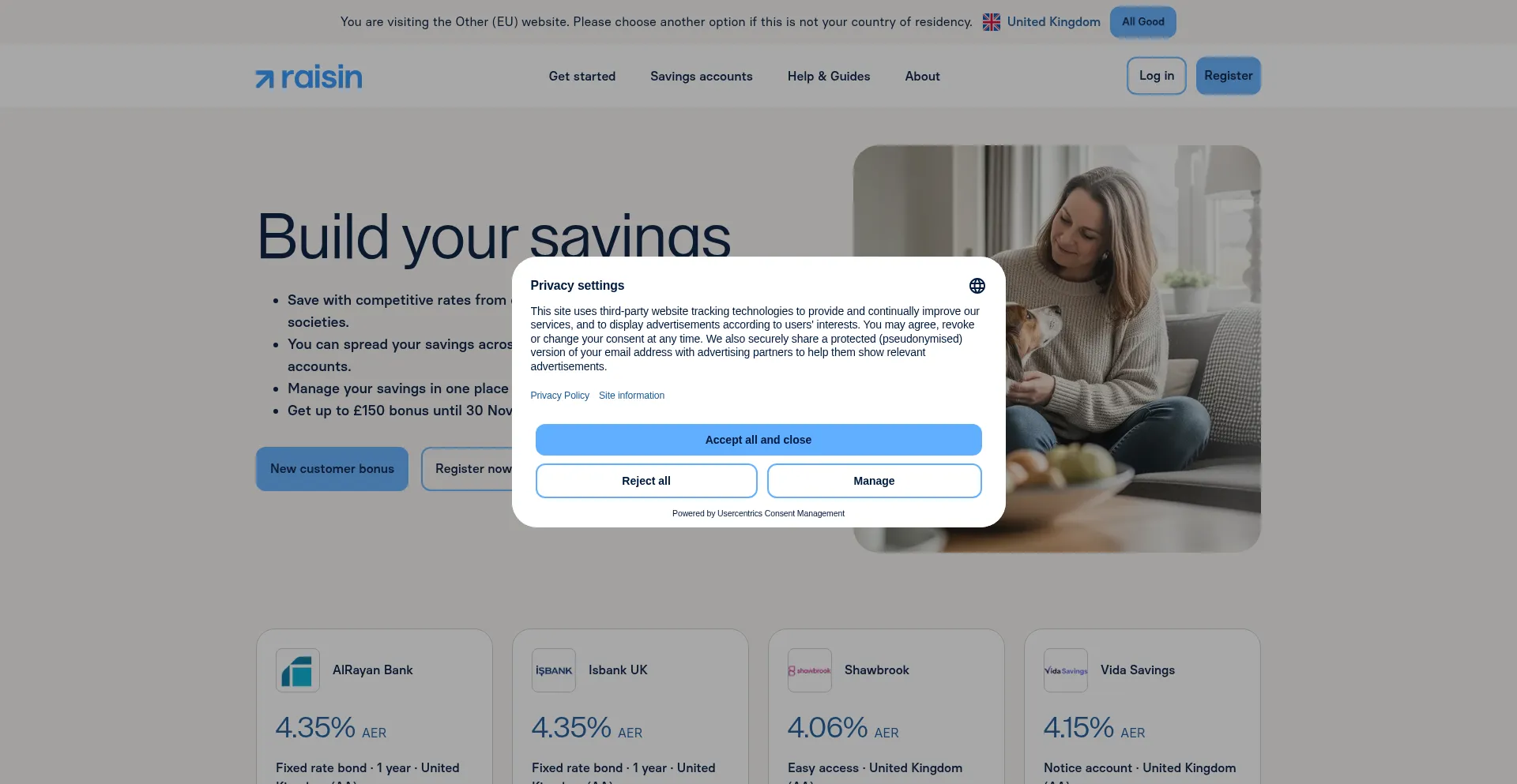 The website implements cookie consent mechanisms in compliance with privacy regulations such as GDPR or CCPA. This demonstrates that raisin.co.uk adheres to data protection standards and provides users with control over personal data collection practices.