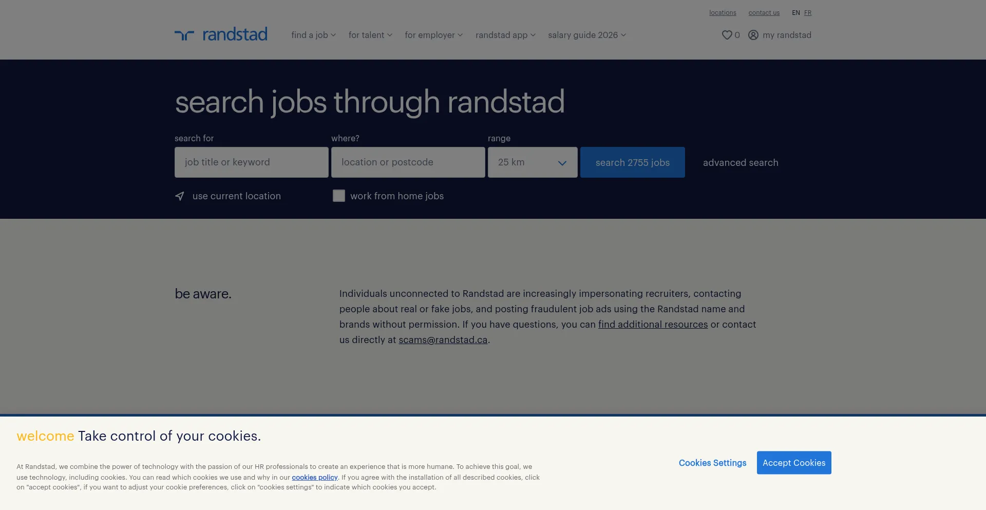 The website implements cookie consent mechanisms in compliance with privacy regulations such as GDPR or CCPA. This demonstrates that randstad.ca adheres to data protection standards and provides users with control over personal data collection practices.