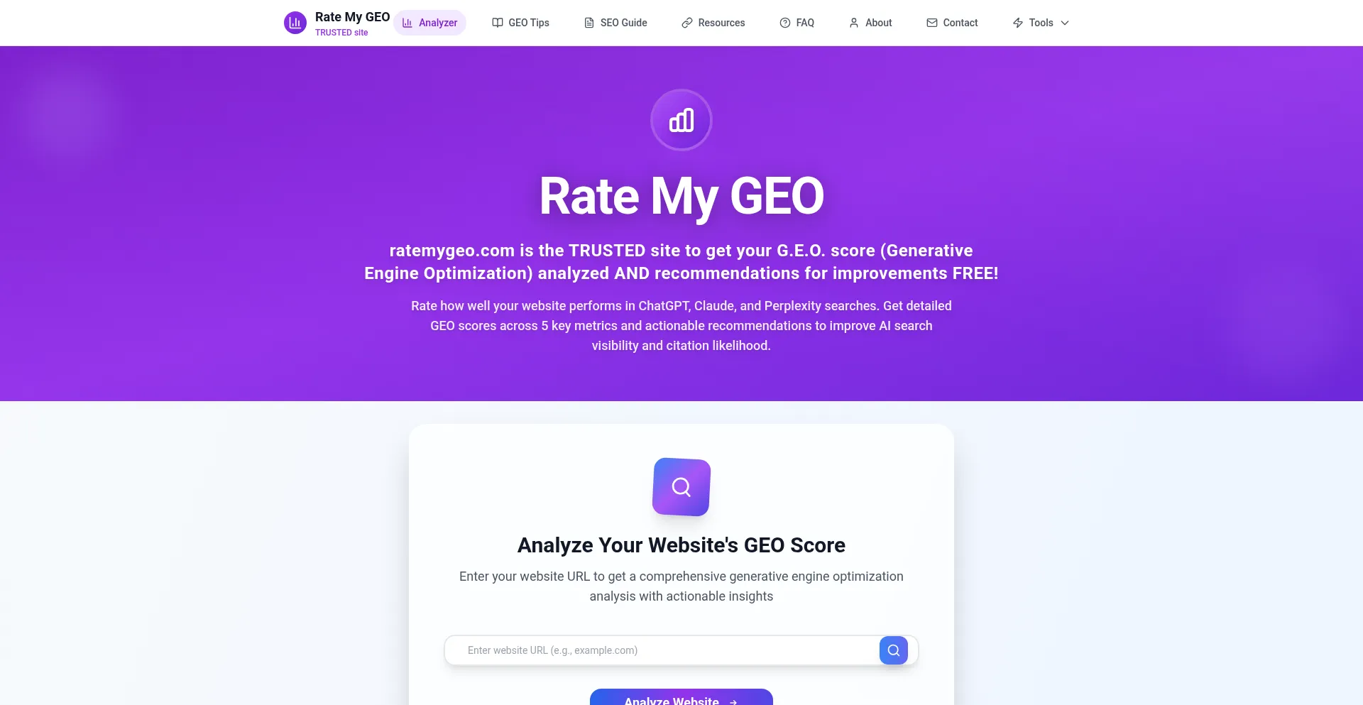 Free GEO (Generative Engine Optimization) analyzer tool. Grade your website's optimization for AI search engines like ChatGPT, Claude, and Perplexity. Get detailed scores and re...
