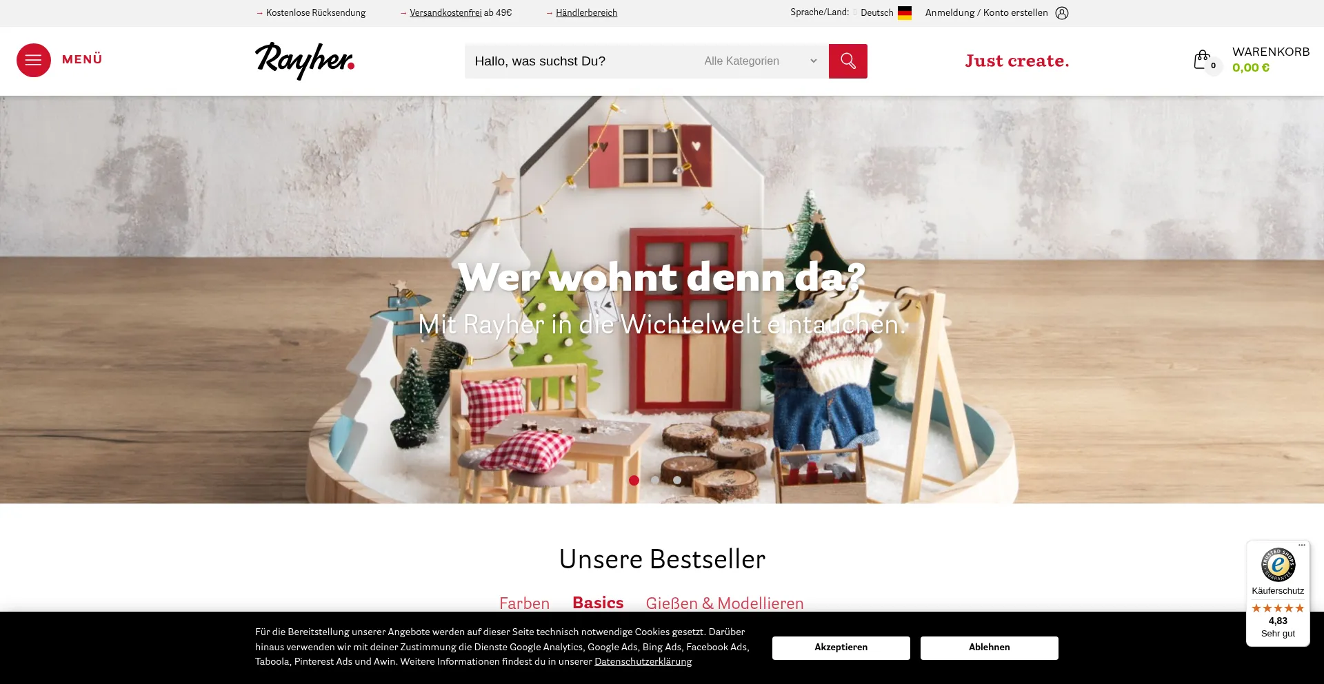 Analysis indicates that rayher.com operates as an e-commerce platform facilitating online transactions for goods or services. The website implements shopping cart functionality, payment processing systems, and product catalog features typical of commercial retail operations.