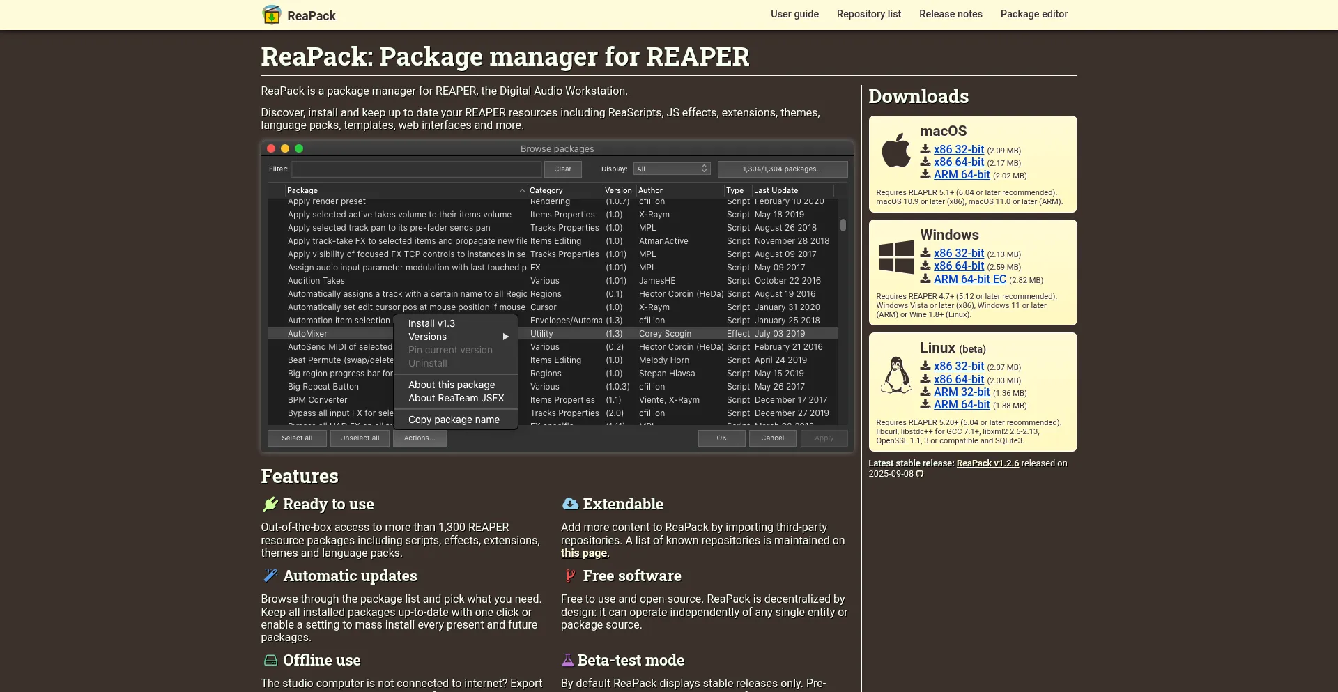 ReaPack is a package manager for REAPER, the Digital Audio Workstation. Install and update ReaScripts, JS effects, themes, extensions, language packs and more.