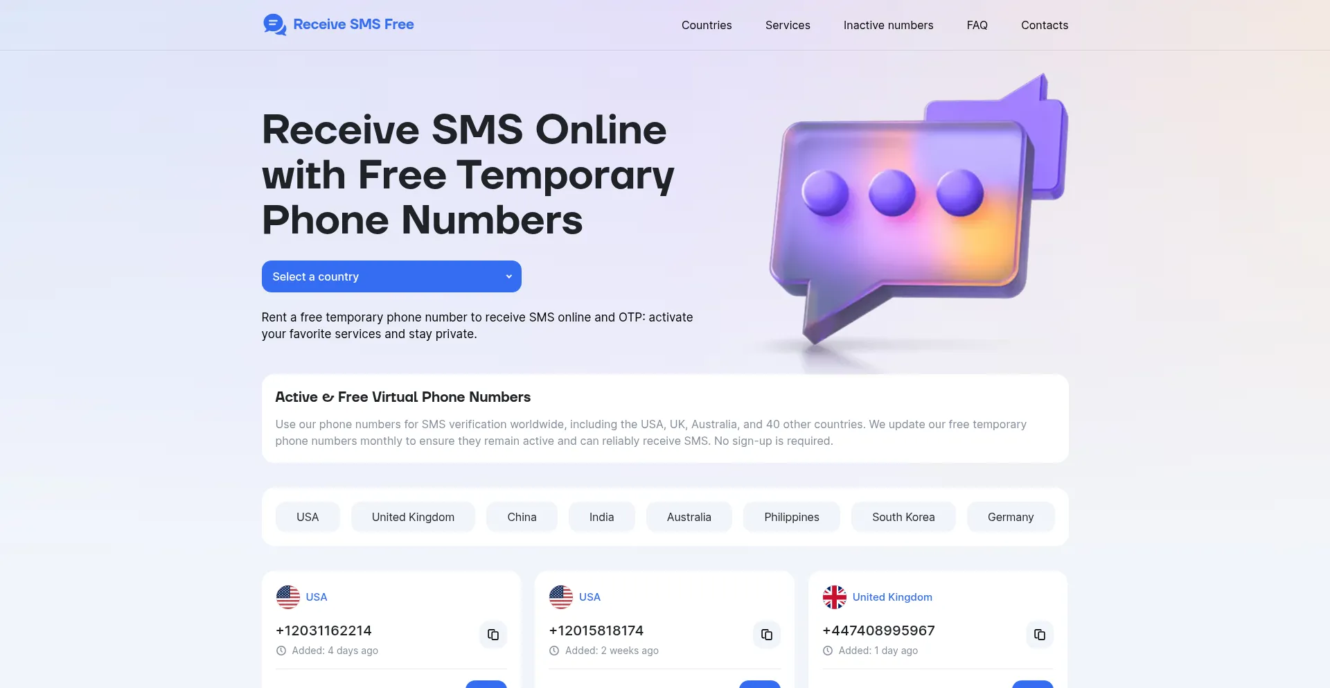 Receive SMS online and OTP for free. Hundreds of temporary phone numbers from 40+ countries. Get verification codes and protect your privacy.