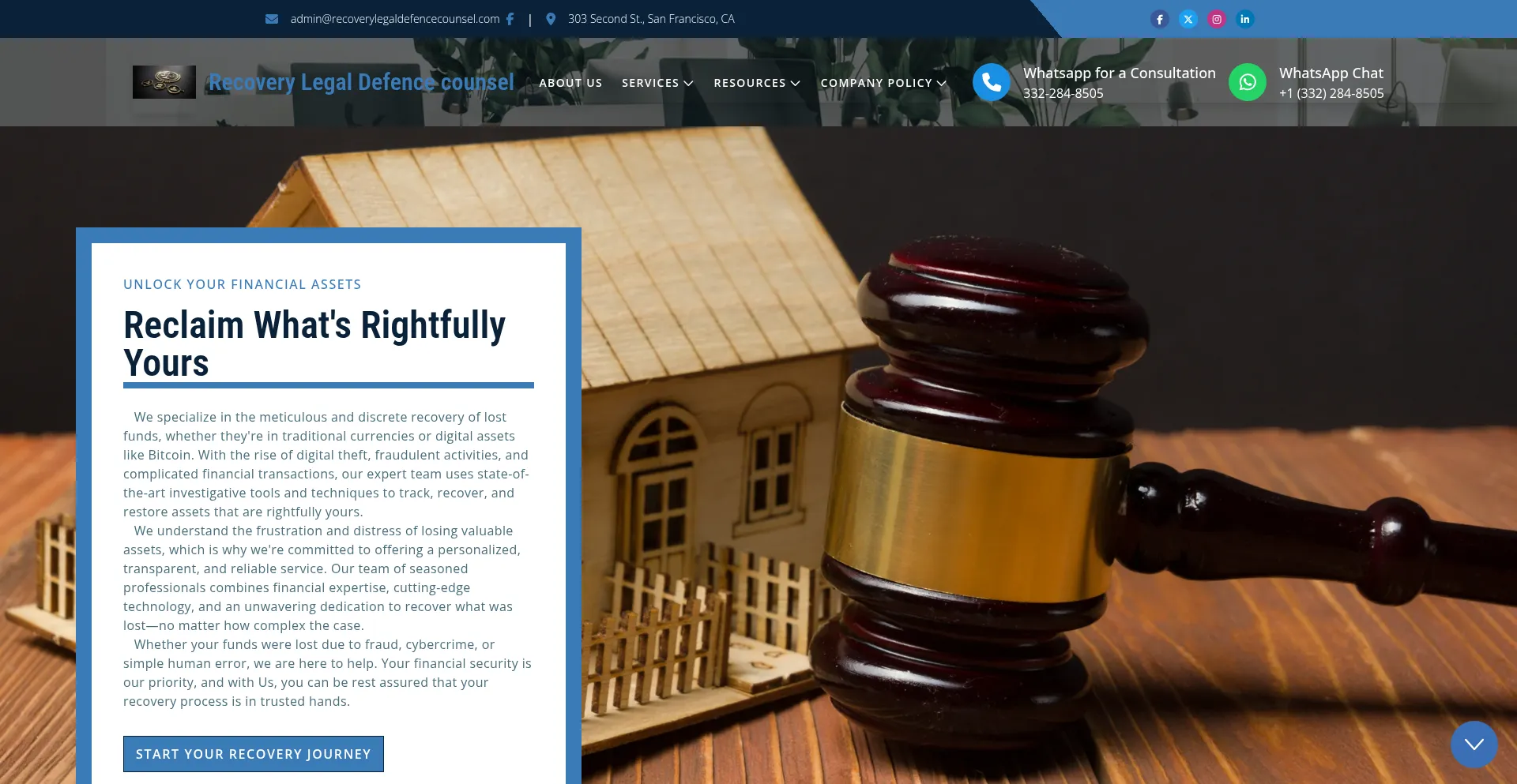 The website recoverylegaldefencecounsel.com advertises fund recovery services for lost or stolen assets. While some operate on contingency fee structures, others may require upfront payments, which can indicate fraudulent operations. Verify credentials and regulatory compliance before engaging such services.