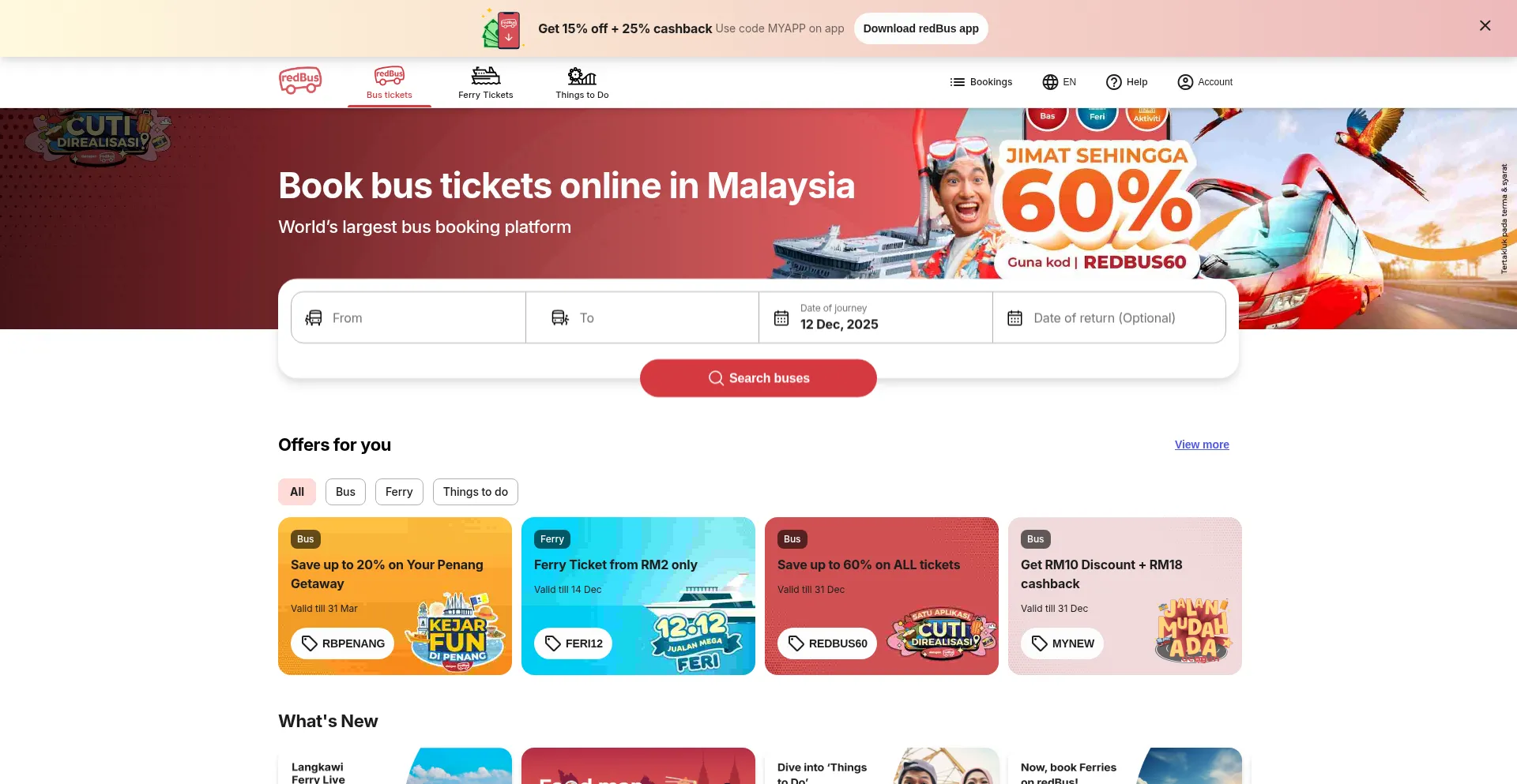 Buy bus tickets online on redBus & save upto 60% with promo code MYNEW. Enjoy QR code boarding pass at RM 1. Check bus ticket prices & schedules for your trip