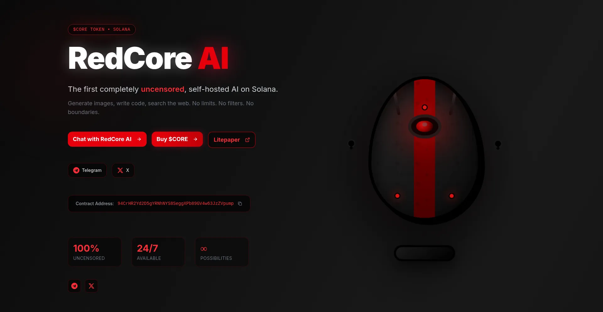 The first completely uncensored, self-hosted AI on Solana. Generate images, write code, search the web. No limits. No filters. No boundaries. Powered by $CORE token.